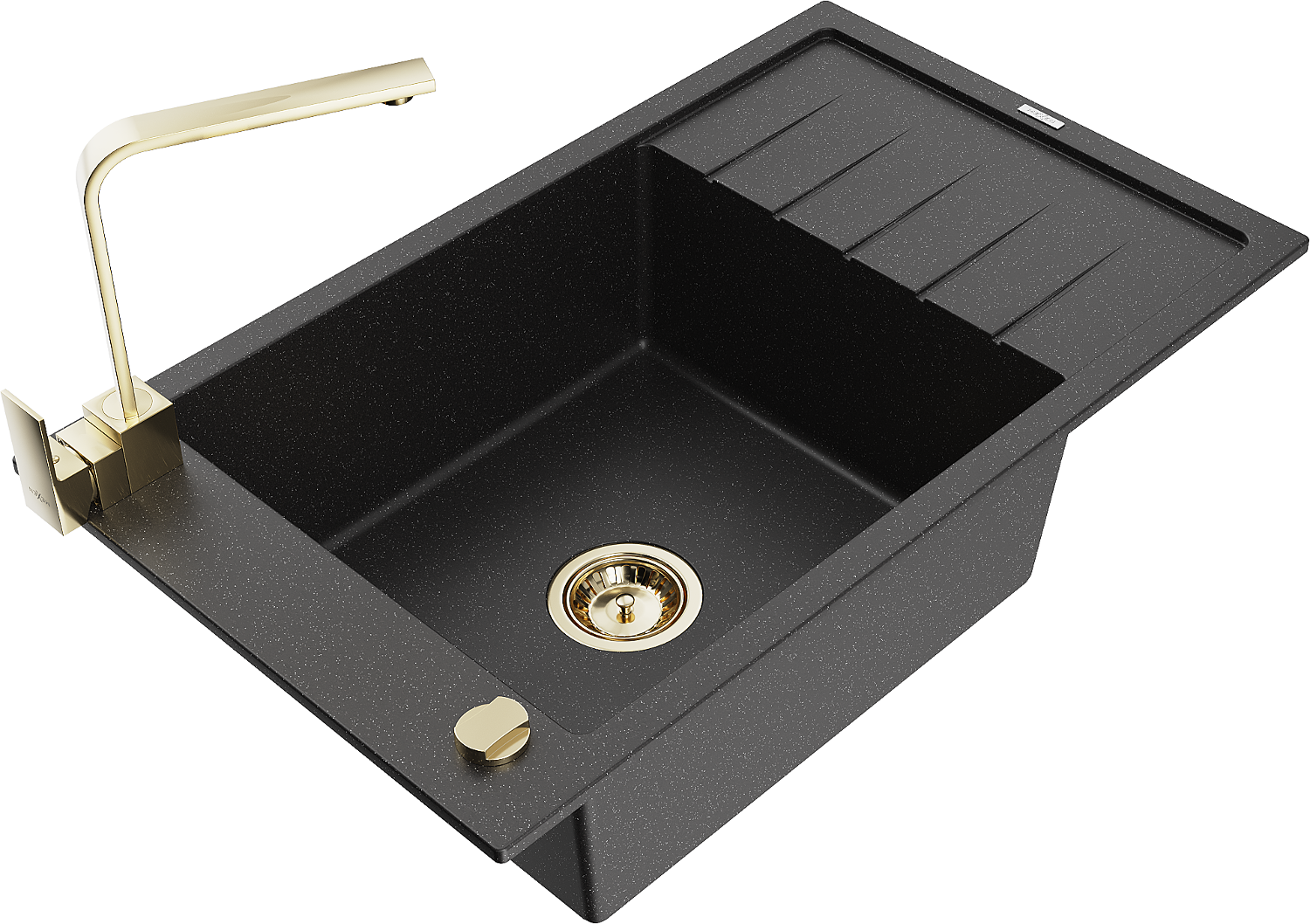 Mexen Elias évier en granit 1 bac avec égouttoir et robinet de cuisine Rita, noir/argent métallisé - 6511-73-670300-50