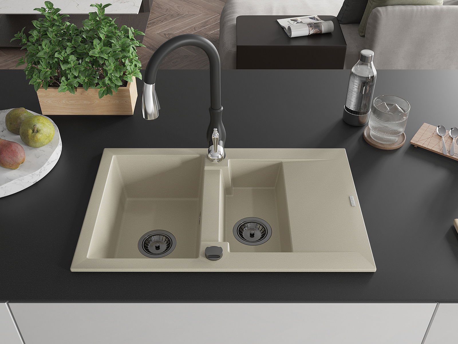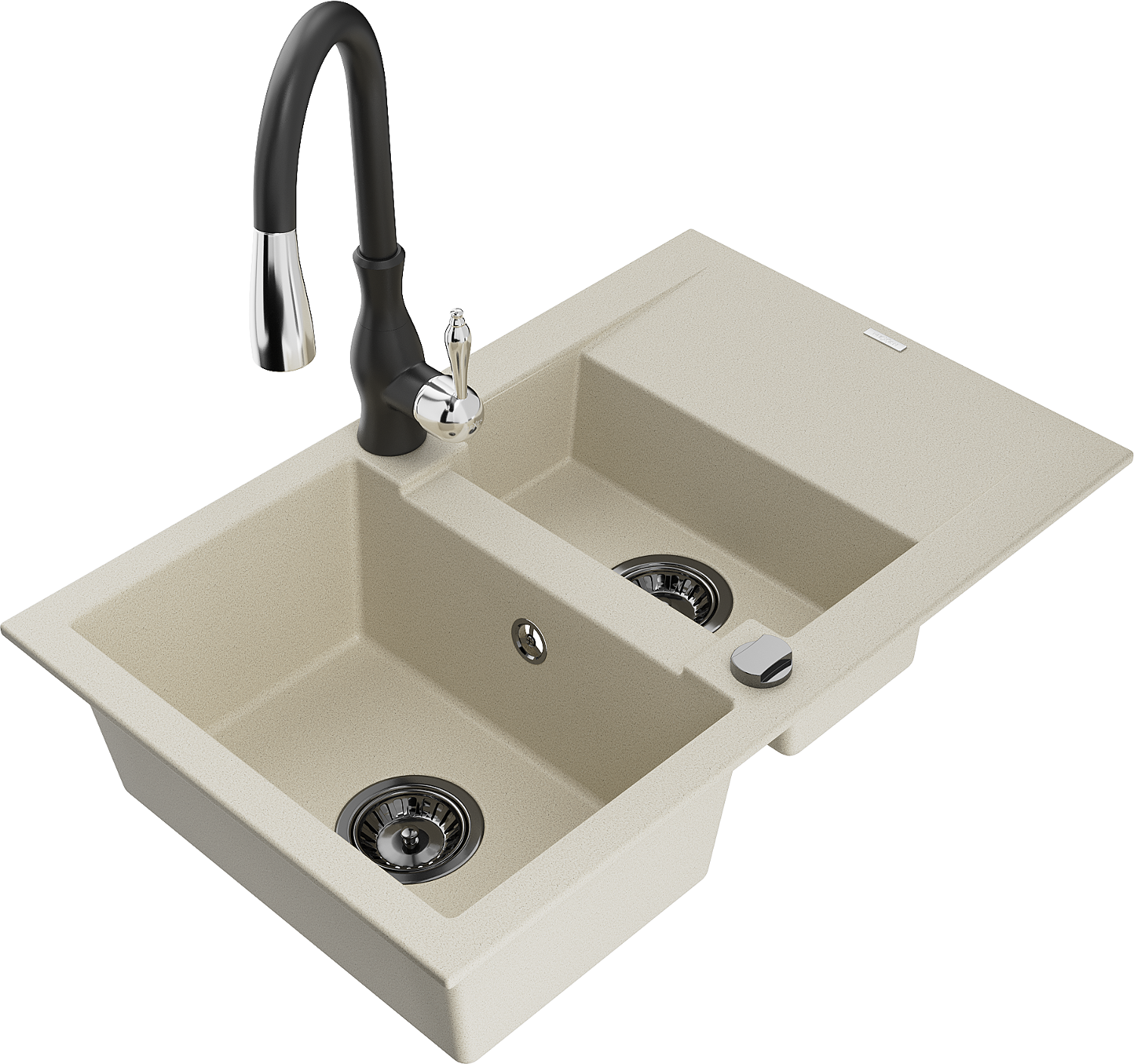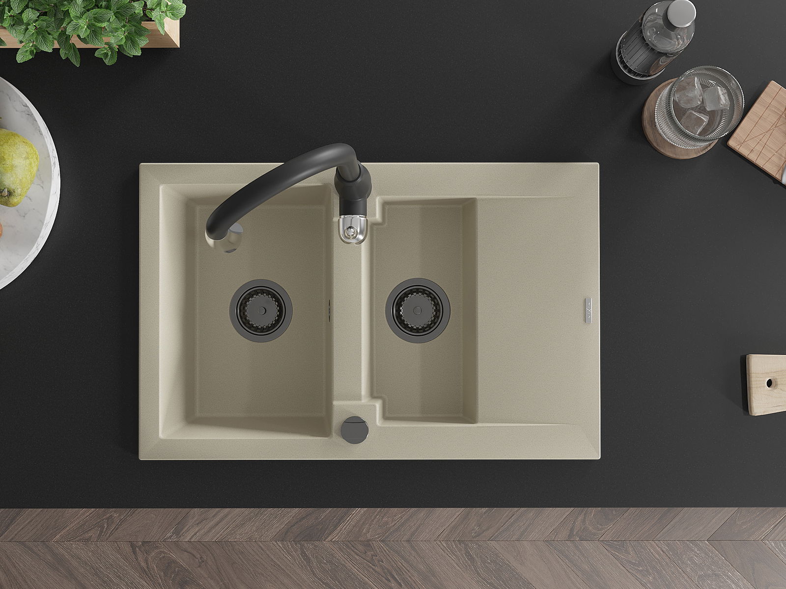 Mexen Gaspar évier en granit 1,5 bac avec égouttoir et robinet de cuisine Savita, beige - 6507-69-672601-70