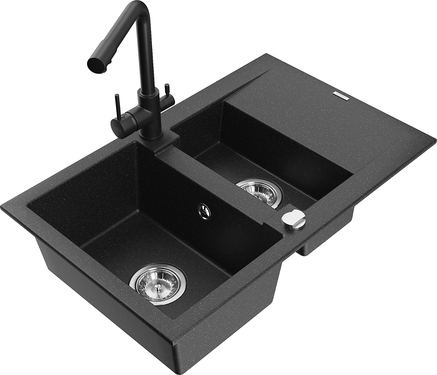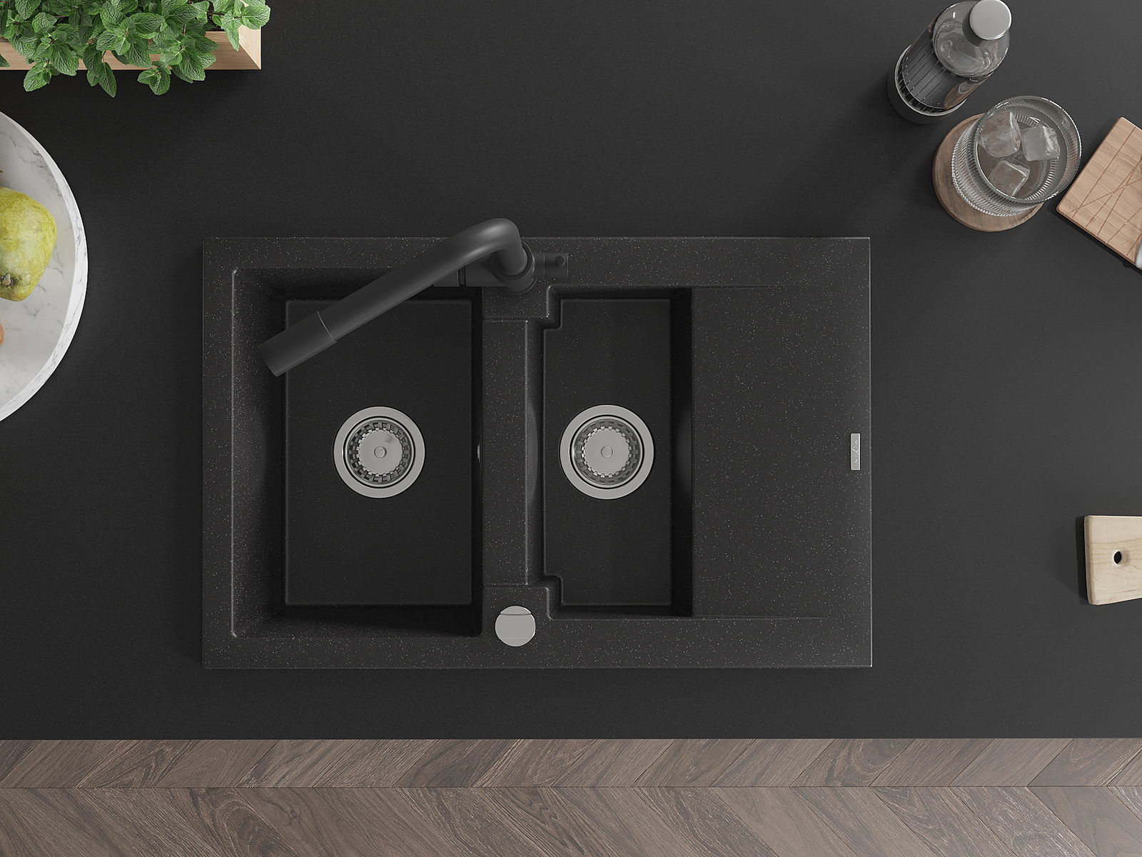 Mexen Gaspar évier en granite 1,5 bac avec égouttoir et robinet de cuisine Duero, noir/argent - 6507-73-671600-70