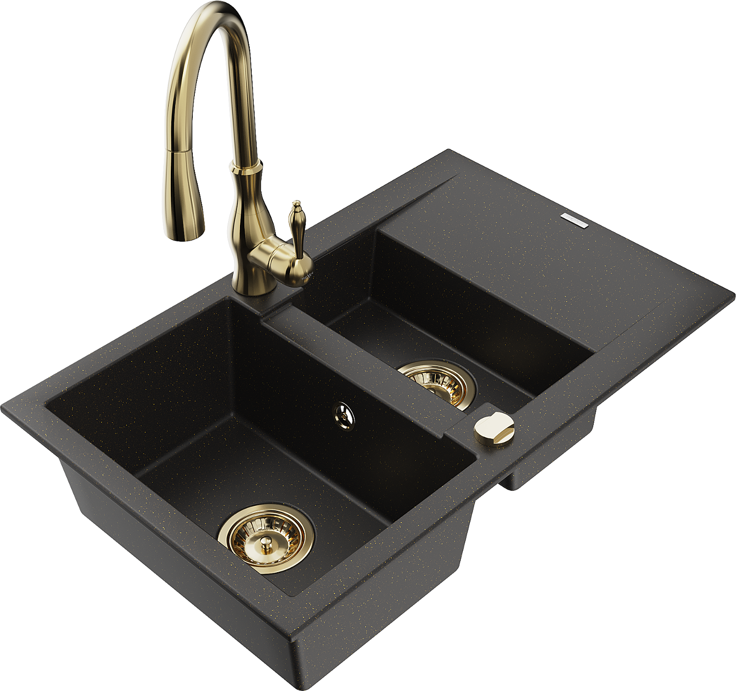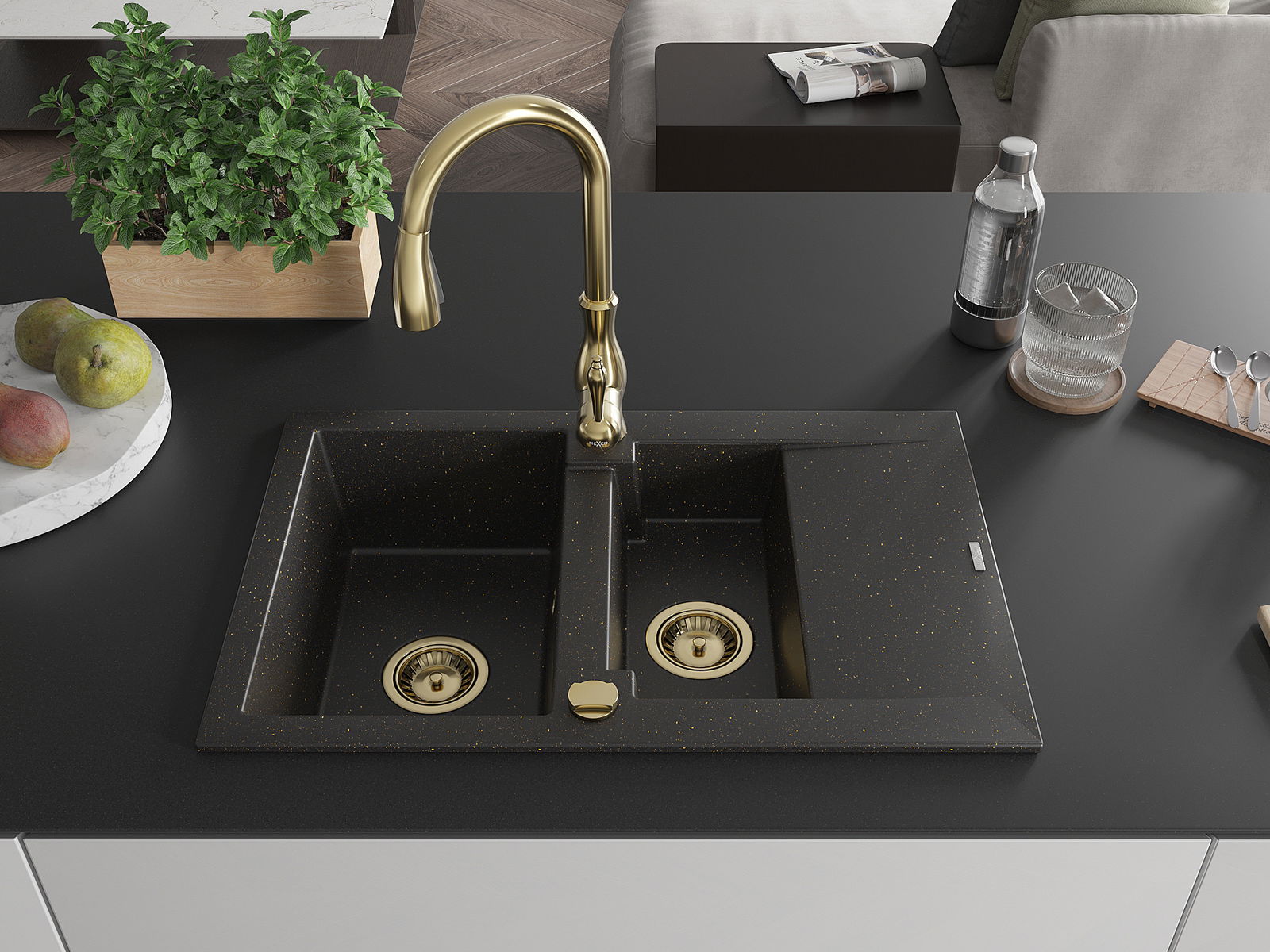 Mexen Gaspar évier en granit 1,5-bacs avec égouttoir et robinet de cuisine Savita, noir/or - 6507-75-672601-50