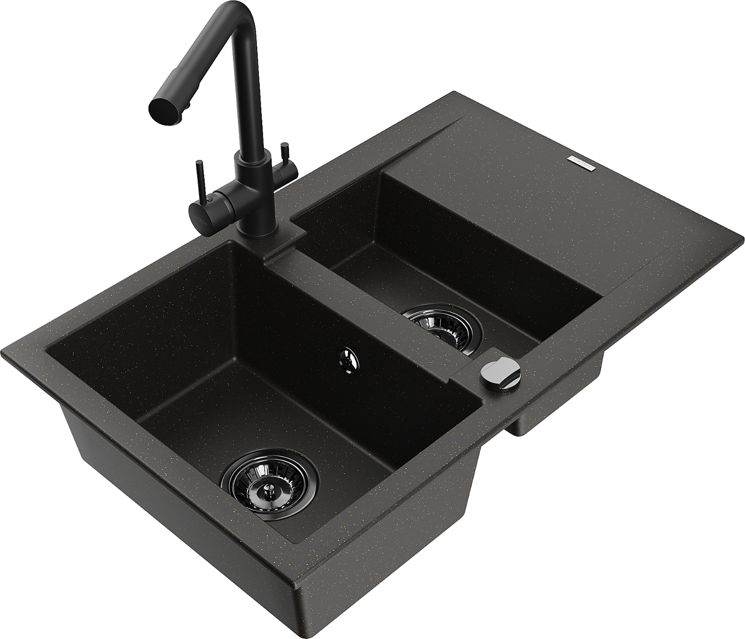Mexen Gaspar évier en granit 1,5 cuves avec égouttoir et robinet de cuisine Duero, noir/or - 6507-75-671600-70-B