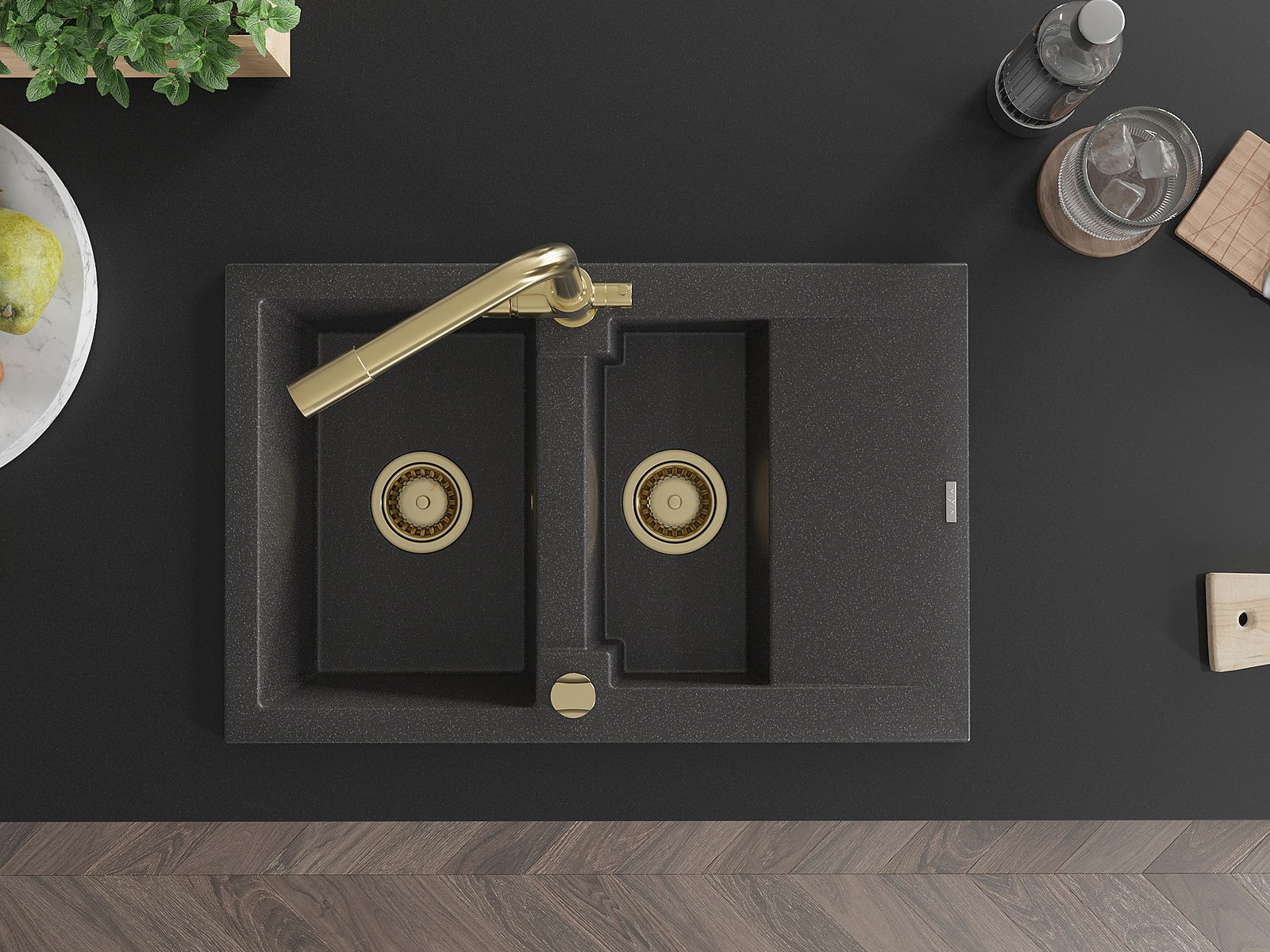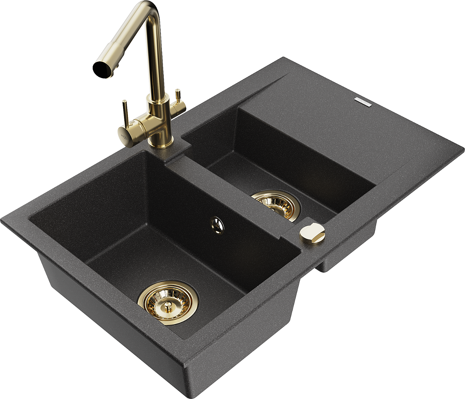 Évier granitique Mexen Gaspar 1,5 bac avec égouttoir et robinet de cuisine Duero, noir moucheté - 6507-76-671600-50