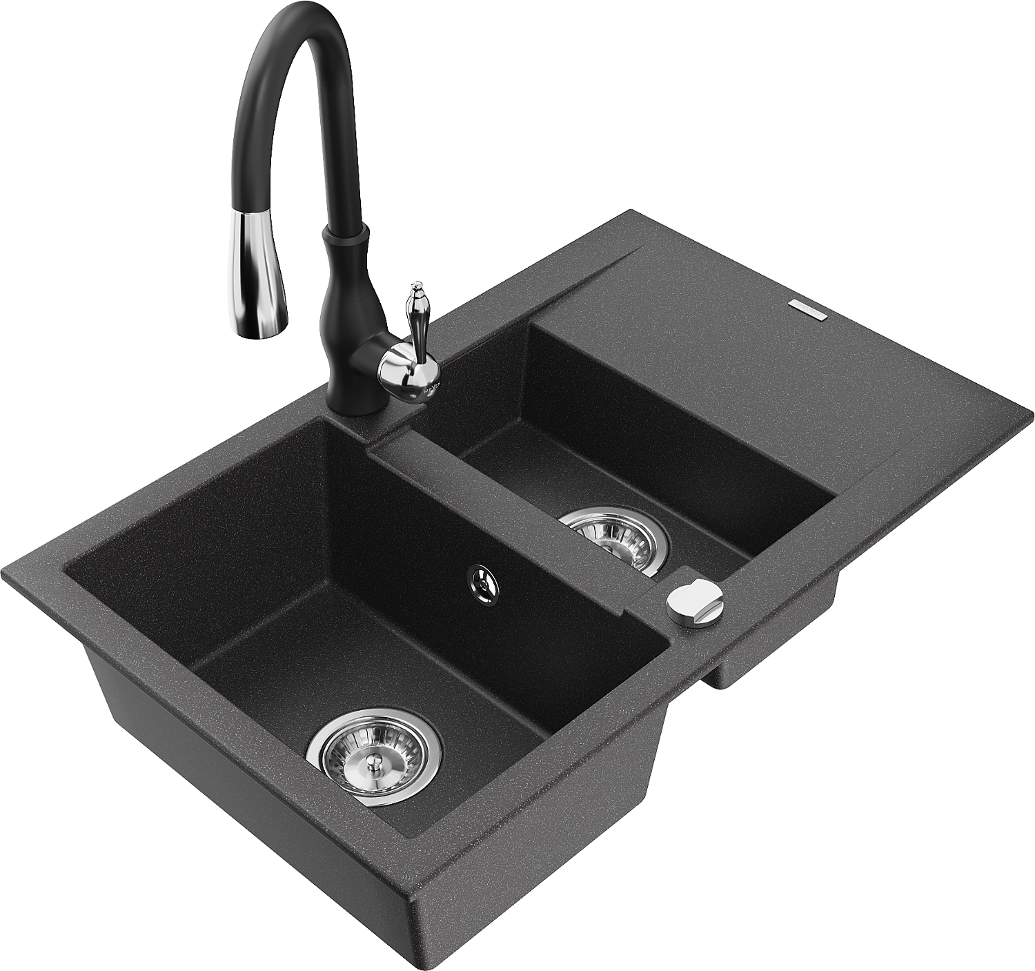 Mexen Gaspar évier en granit 1,5 bac avec égouttoir et robinet de cuisine Savita, noir moucheté - 6507-76-672601-70
