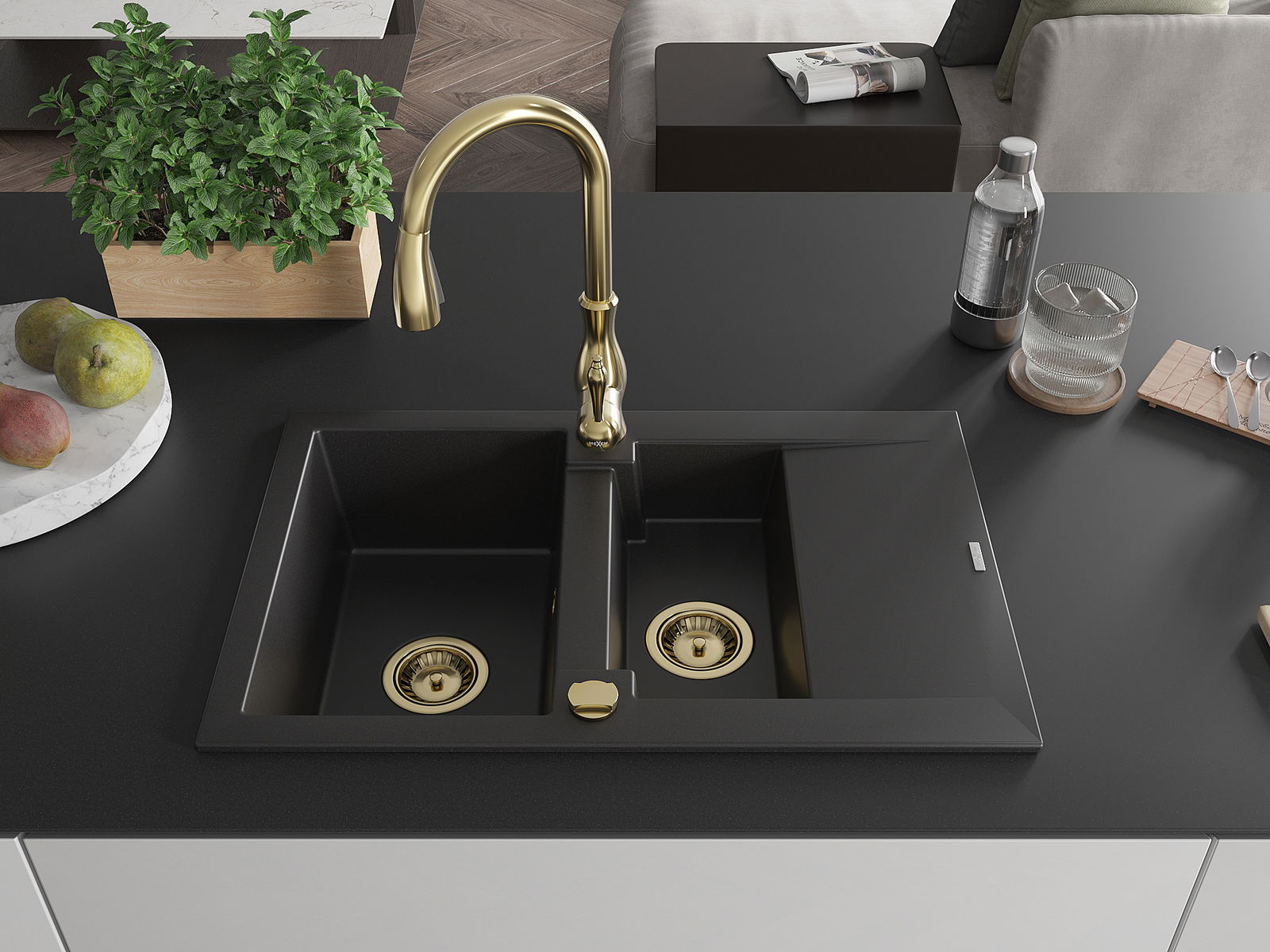 Mexen Gaspar évier en granit 1,5-bac avec égouttoir et robinet de cuisine Savita, noir - 6507-77-672601-50