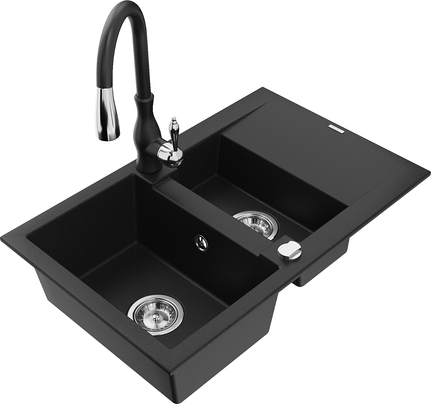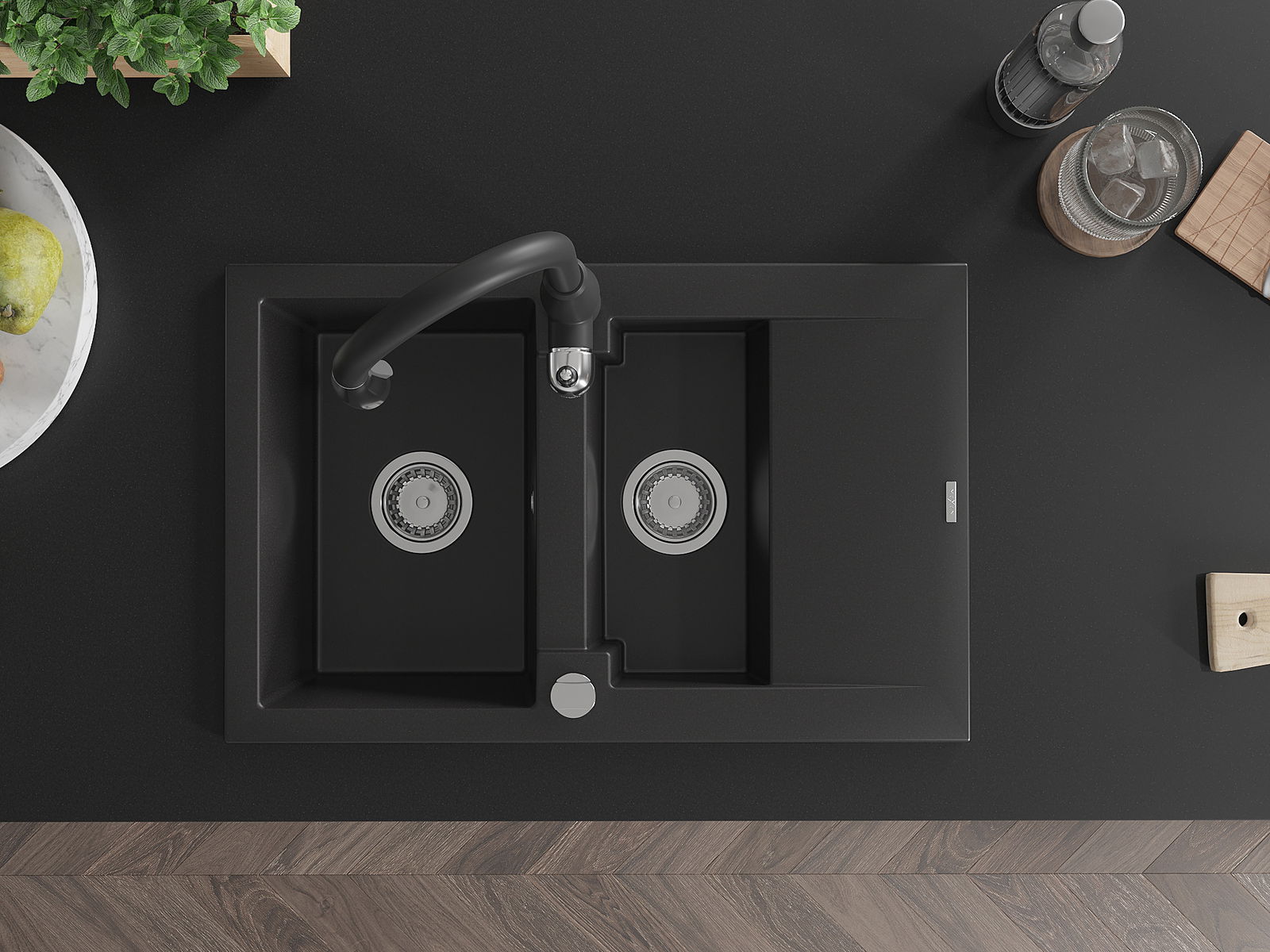 Mexen Gaspar évier en granit 1,5-bac avec égouttoir et robinet de cuisine Savita, noir - 6507-77-672601-70
