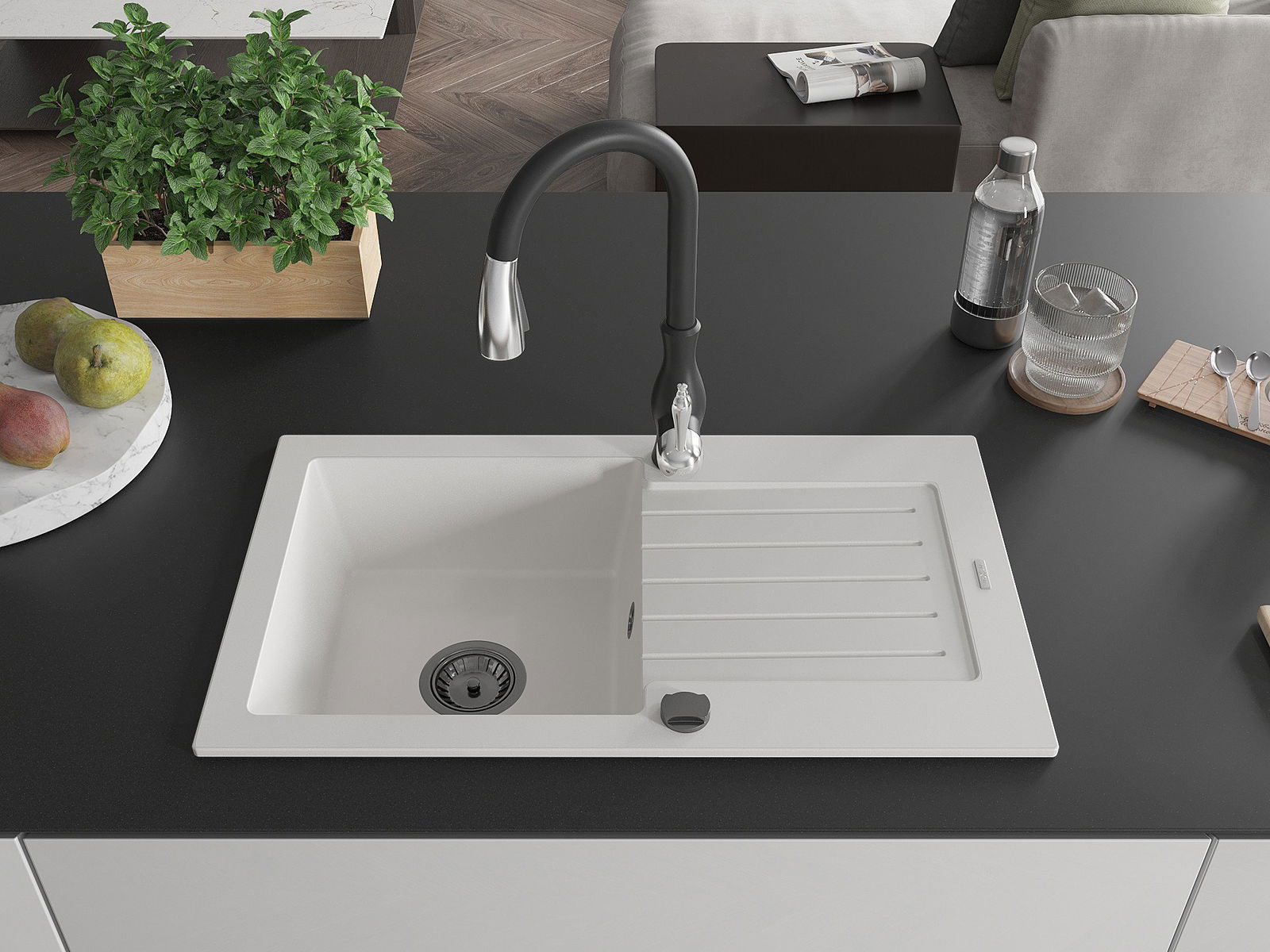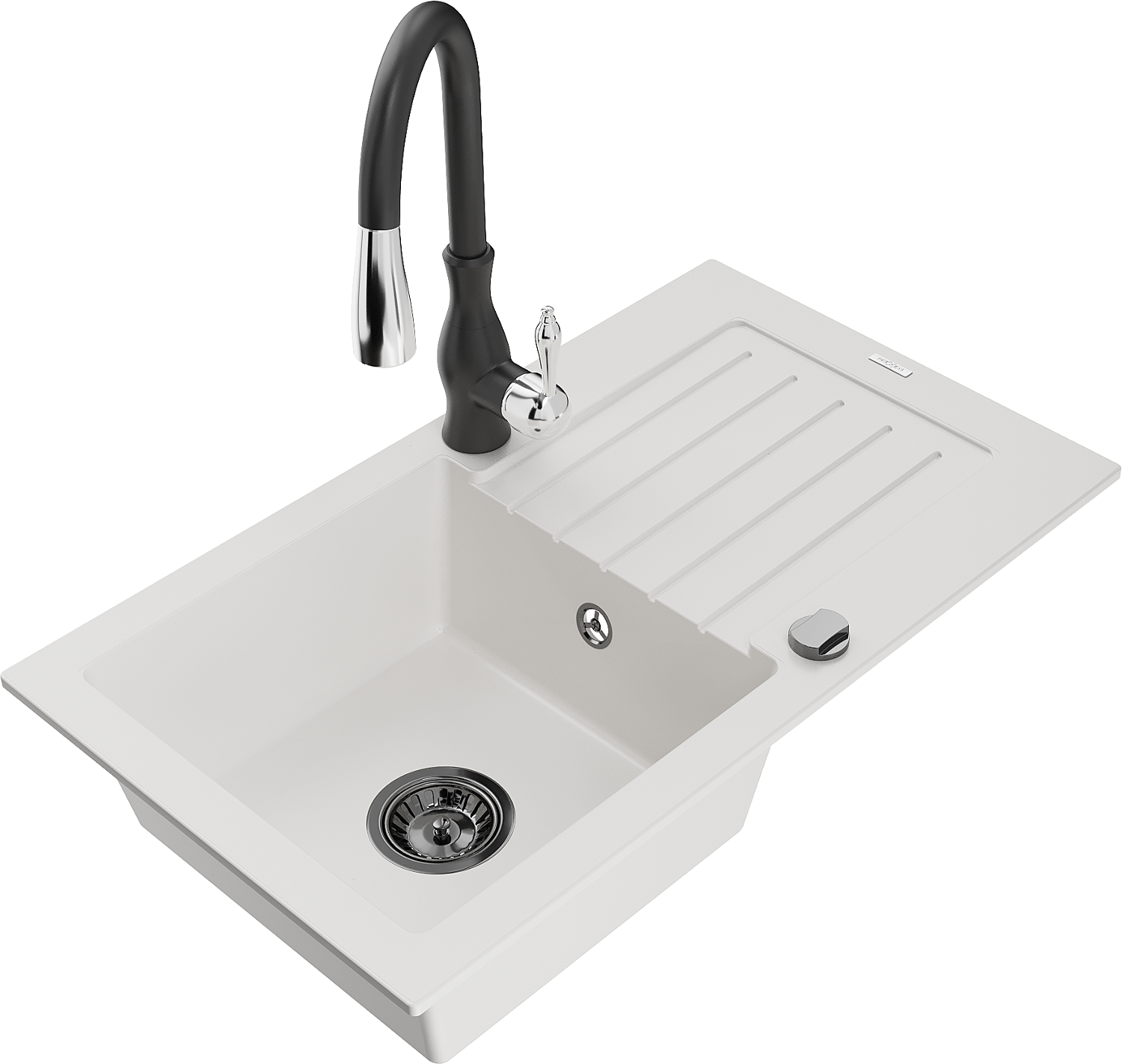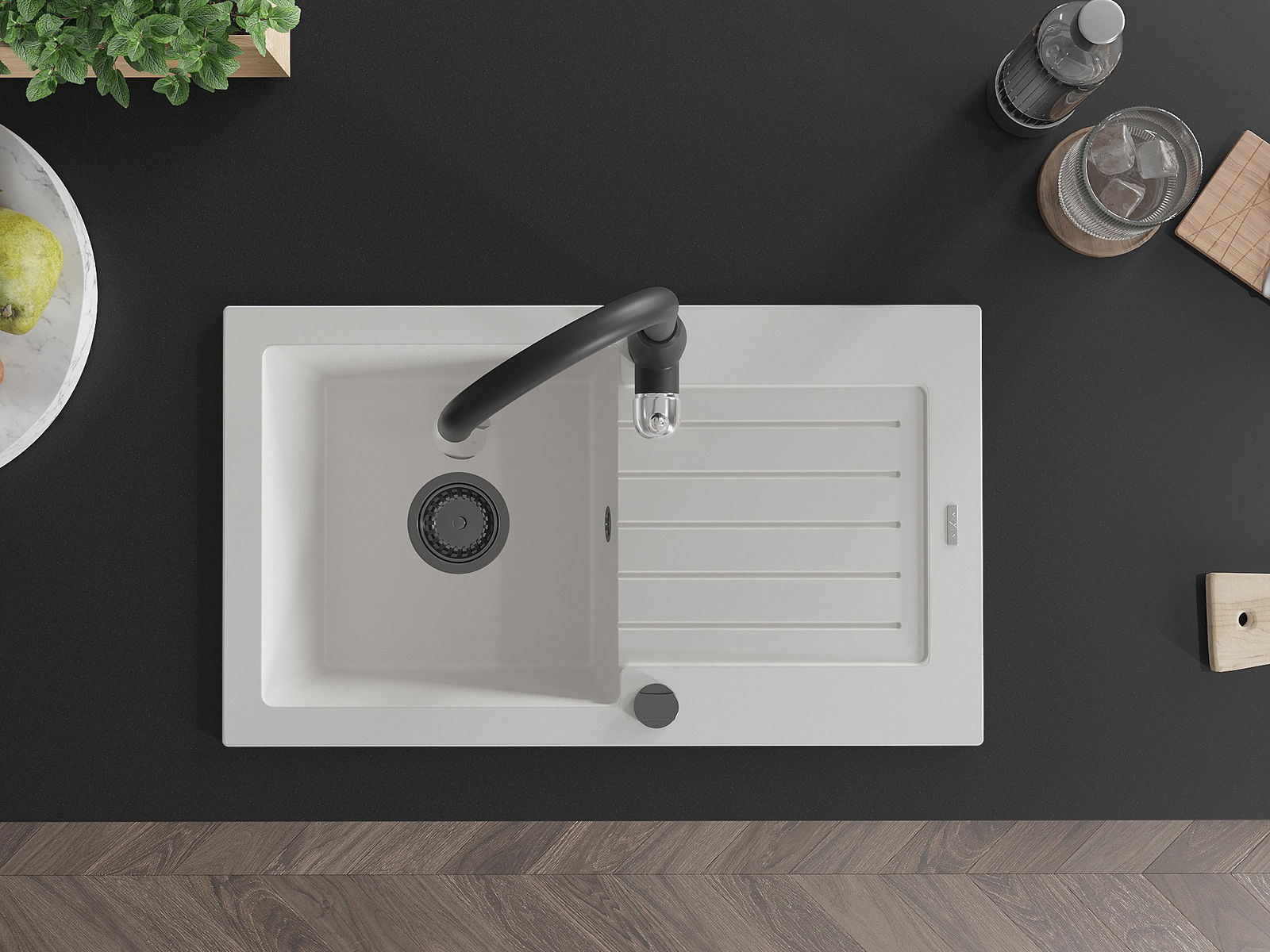 Mexen Pablo évier de cuisine en granit 1 bac avec égouttoir et robinet de cuisine Savita, blanc - 6510-20-672601-70