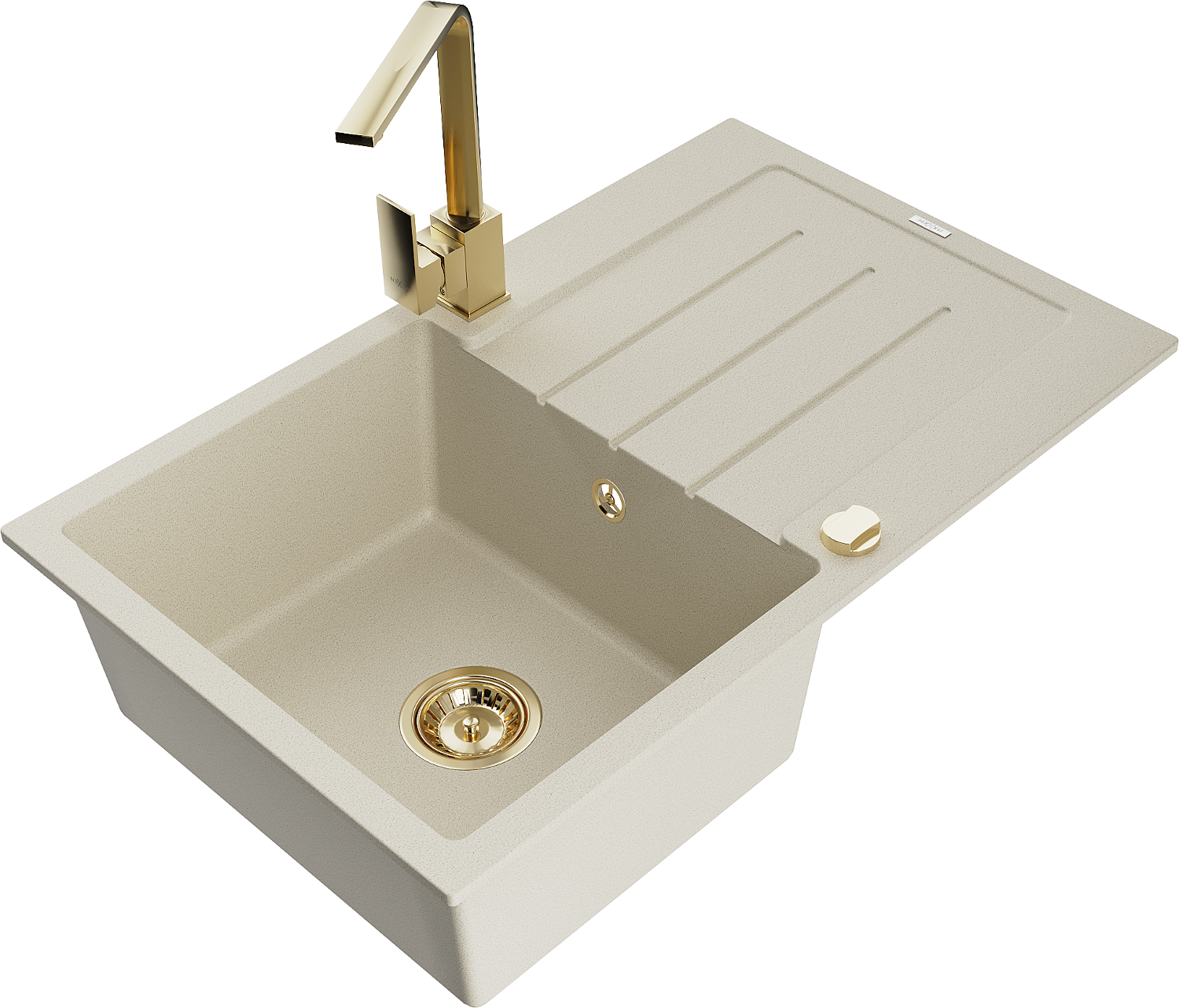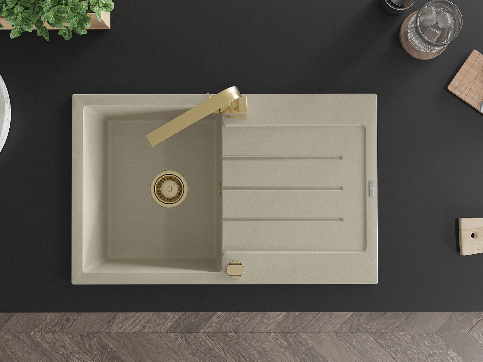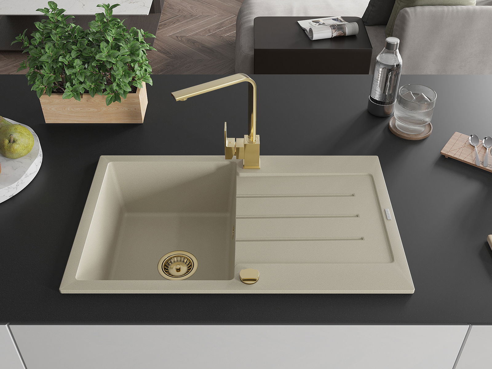 Mexen Bruno évier granit 1 bac avec égouttoir et robinet de cuisine Rita, beige - 6513-69-670300-50