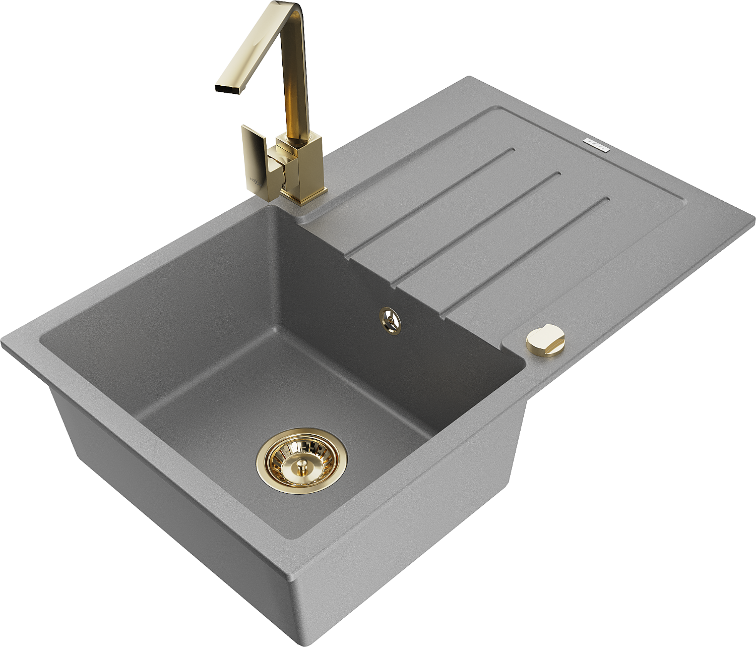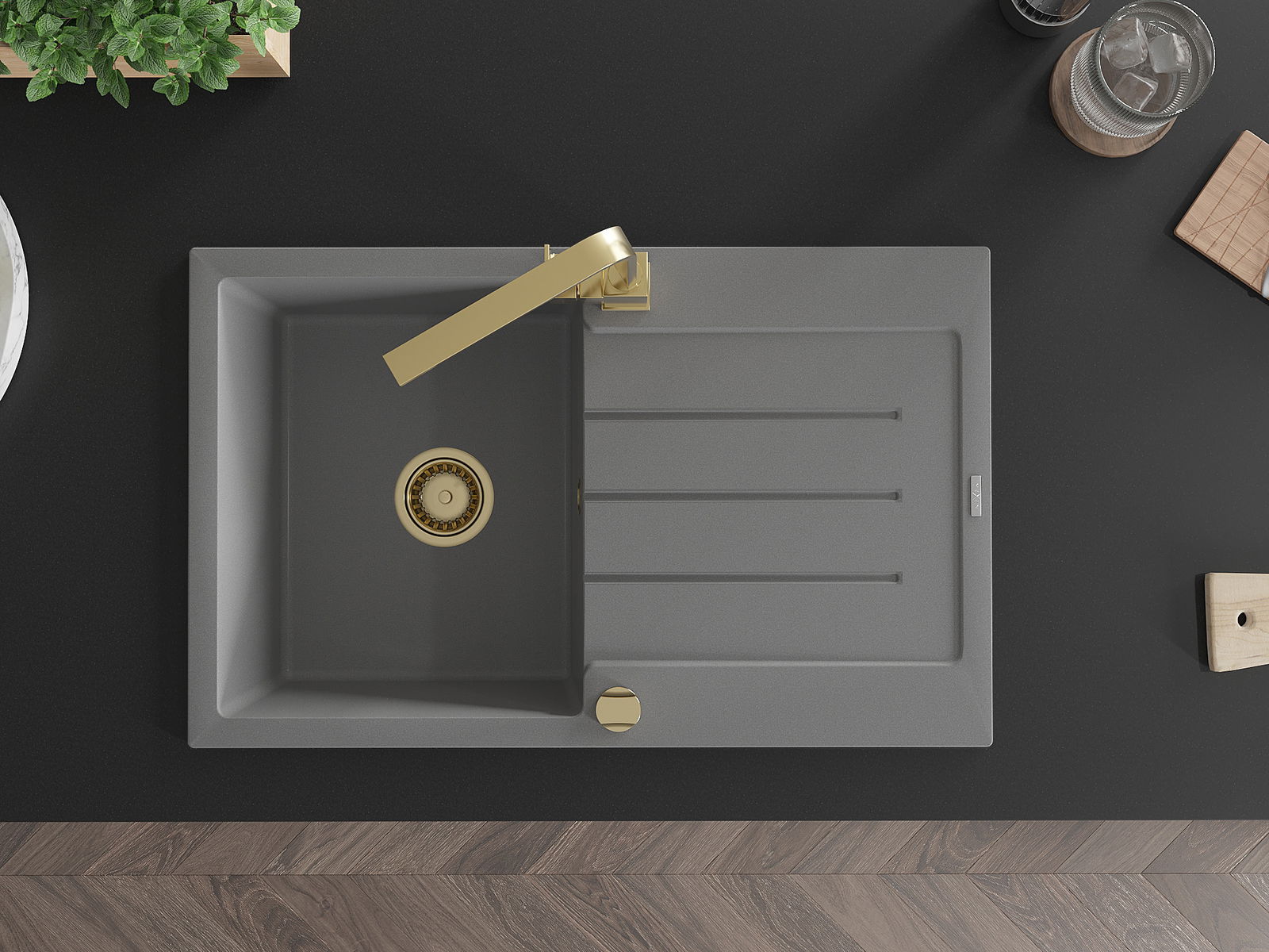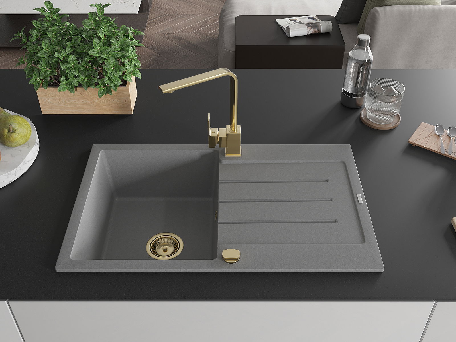 Mexen Bruno évier en granit 1 bac avec égouttoir et robinet de cuisine Rita, gris - 6513-71-670300-50