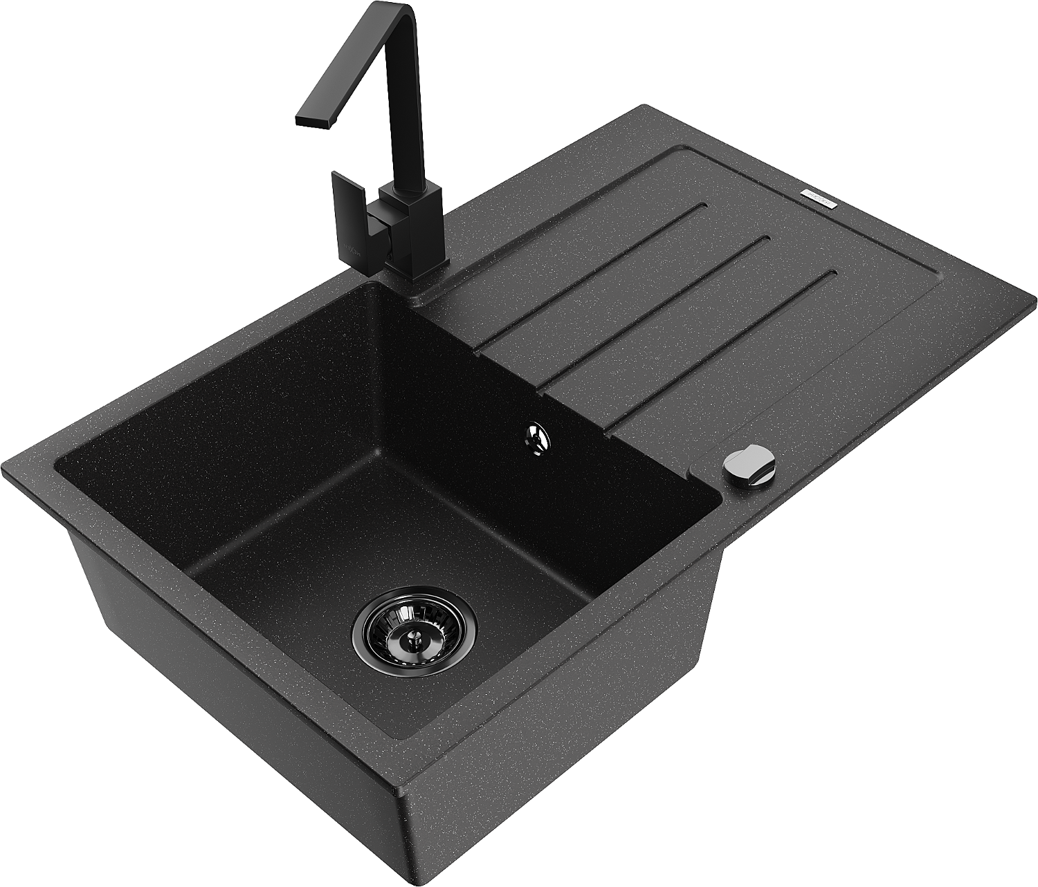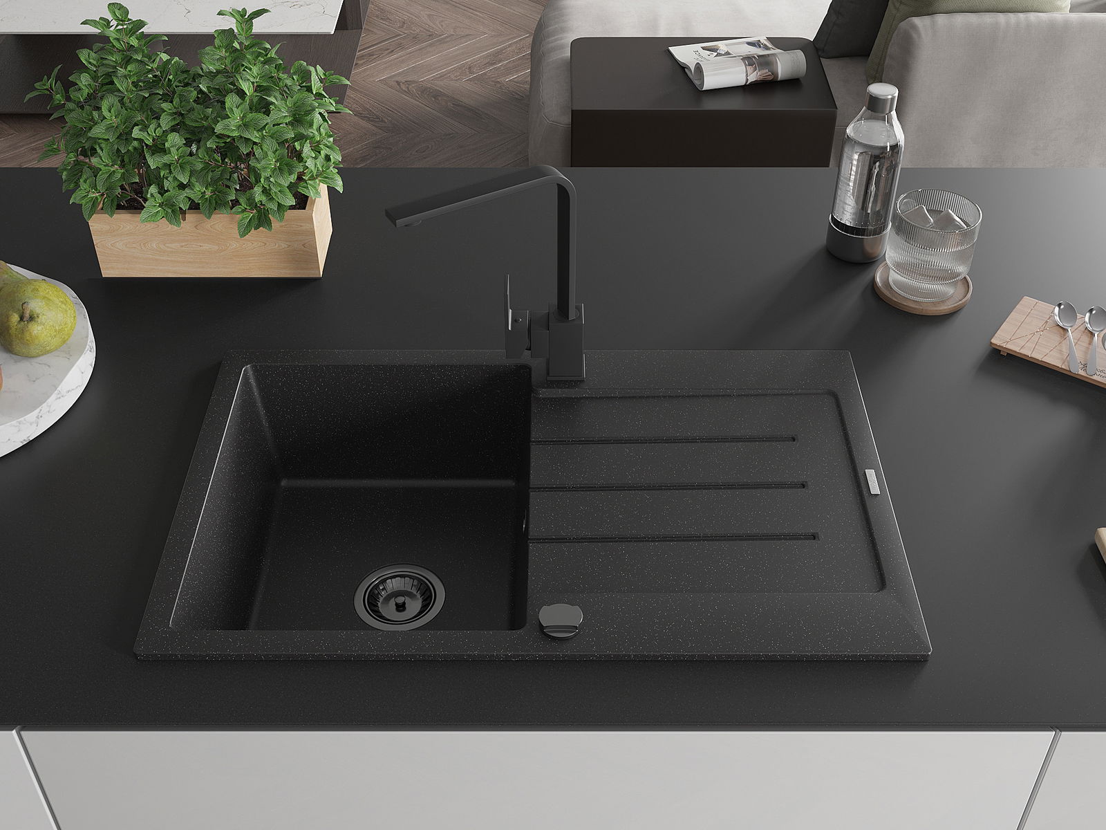 Mexen Bruno évier en granit 1 bac avec égouttoir et robinet de cuisine Rita, noir / métal argenté - 6513-73-670300-70-B