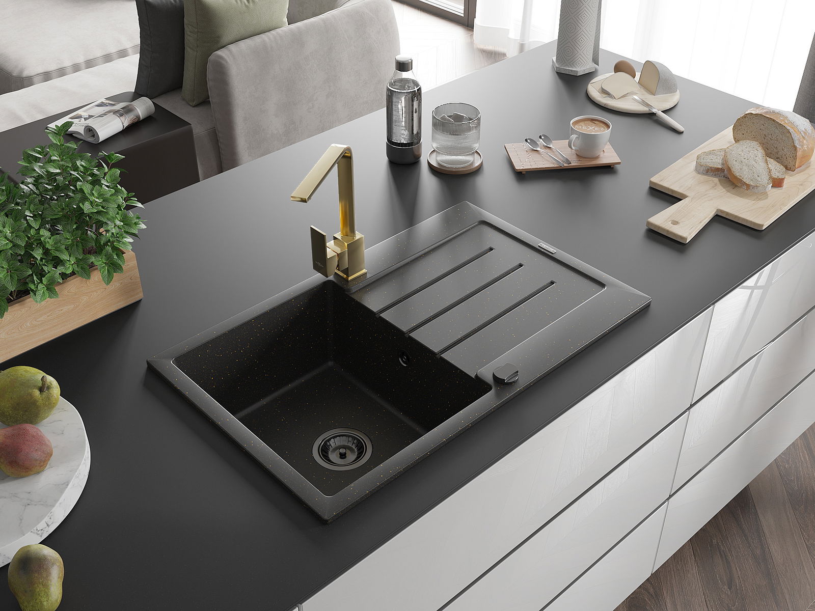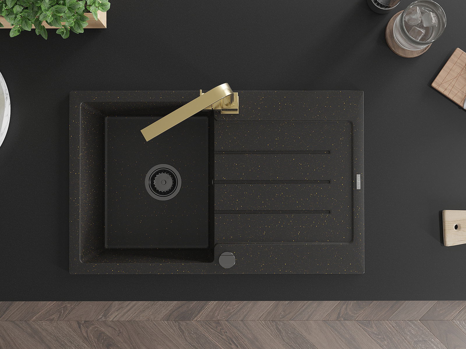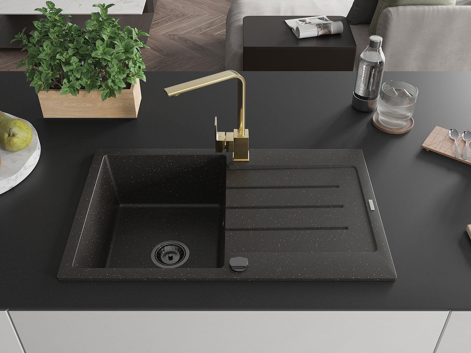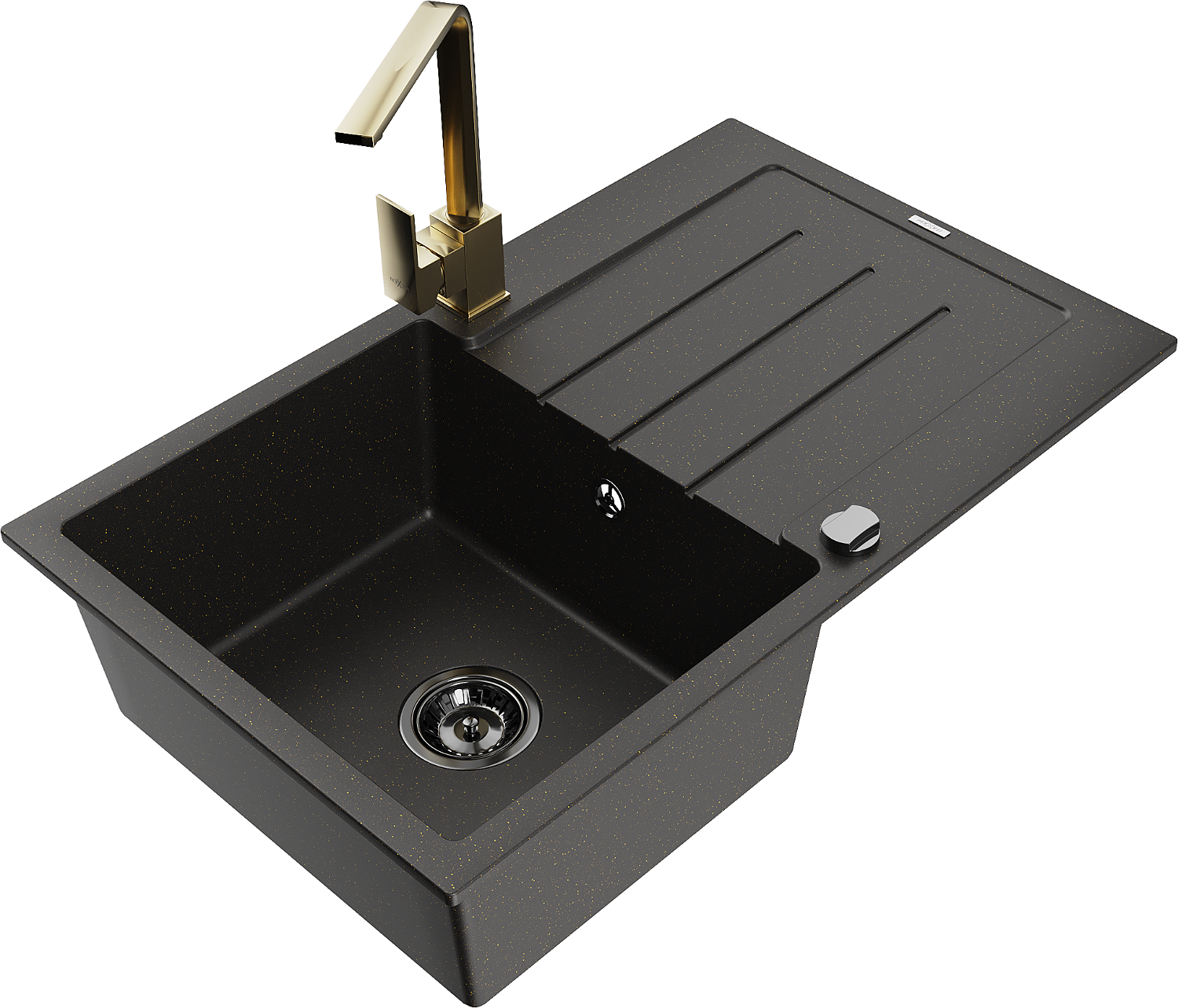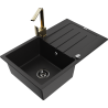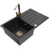 Mexen Bruno évier en granit 1 bac avec égouttoir et robinet de cuisine Rita, noir/métallisé doré - 6513-75-670300-50-B