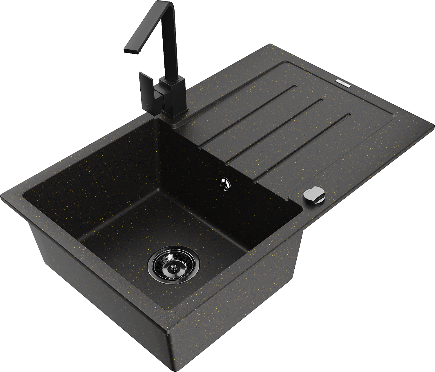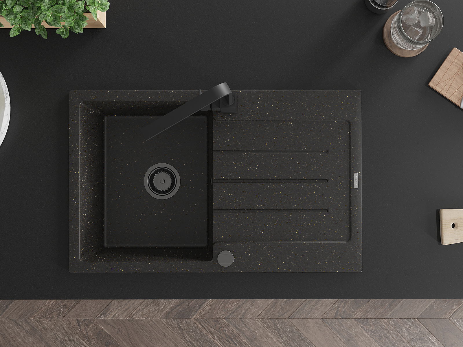 Mexen Bruno évier en granit 1 bac avec égouttoir et robinet de cuisine Rita, noir/doré métallisé - 6513-75-670300-70-B