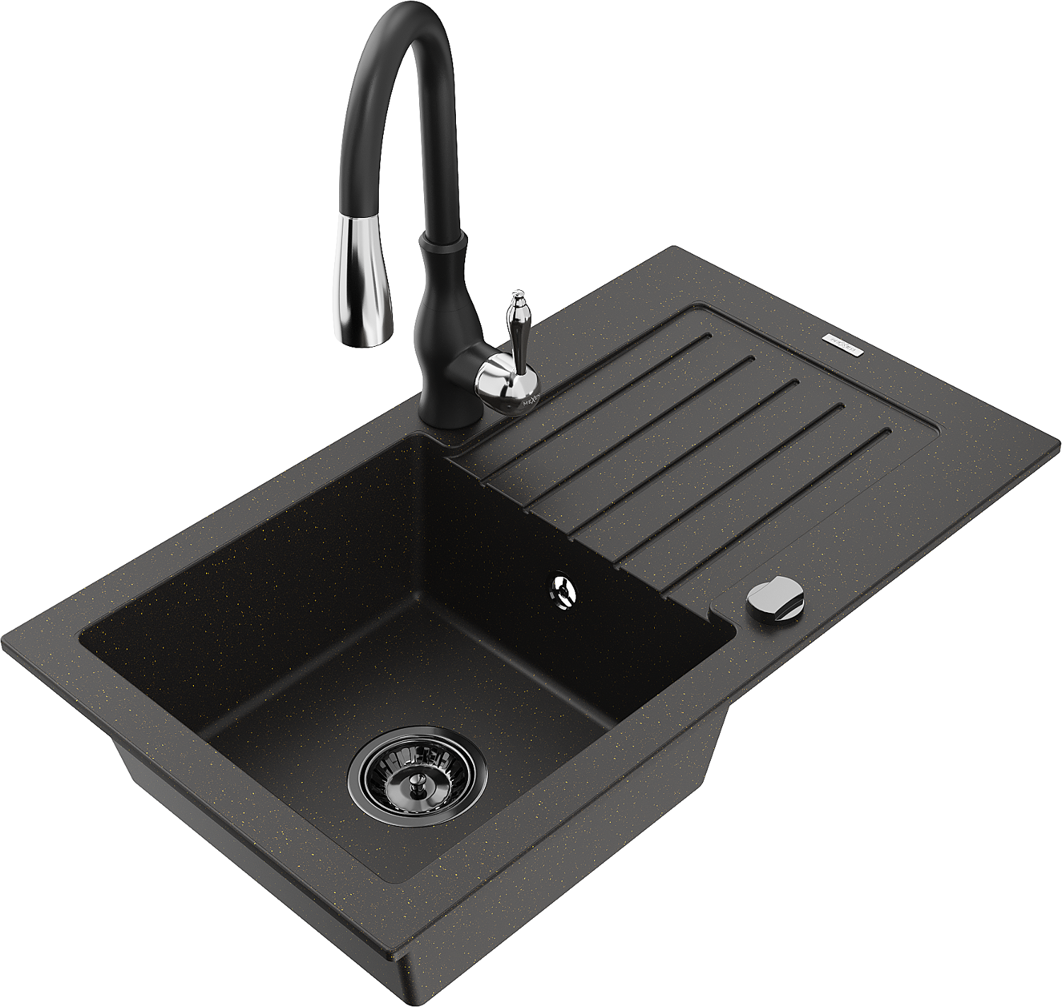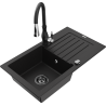 Mexen Pablo évier en granit à 1 bac avec égouttoir et robinet de cuisine Savita, noir/métallique doré - 6510-75-672601-70-B
