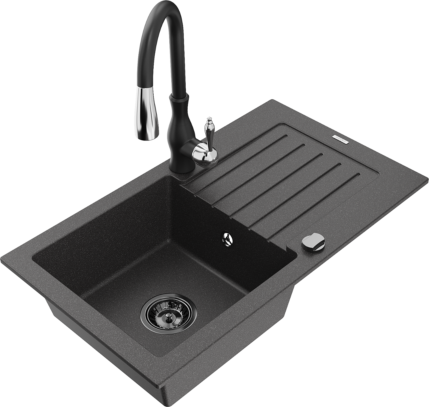 Mexen Pablo évier de cuisine en granit à 1 bac avec égouttoir et robinet de cuisine Savita, noir moucheté - 6510-76-672601-70-B