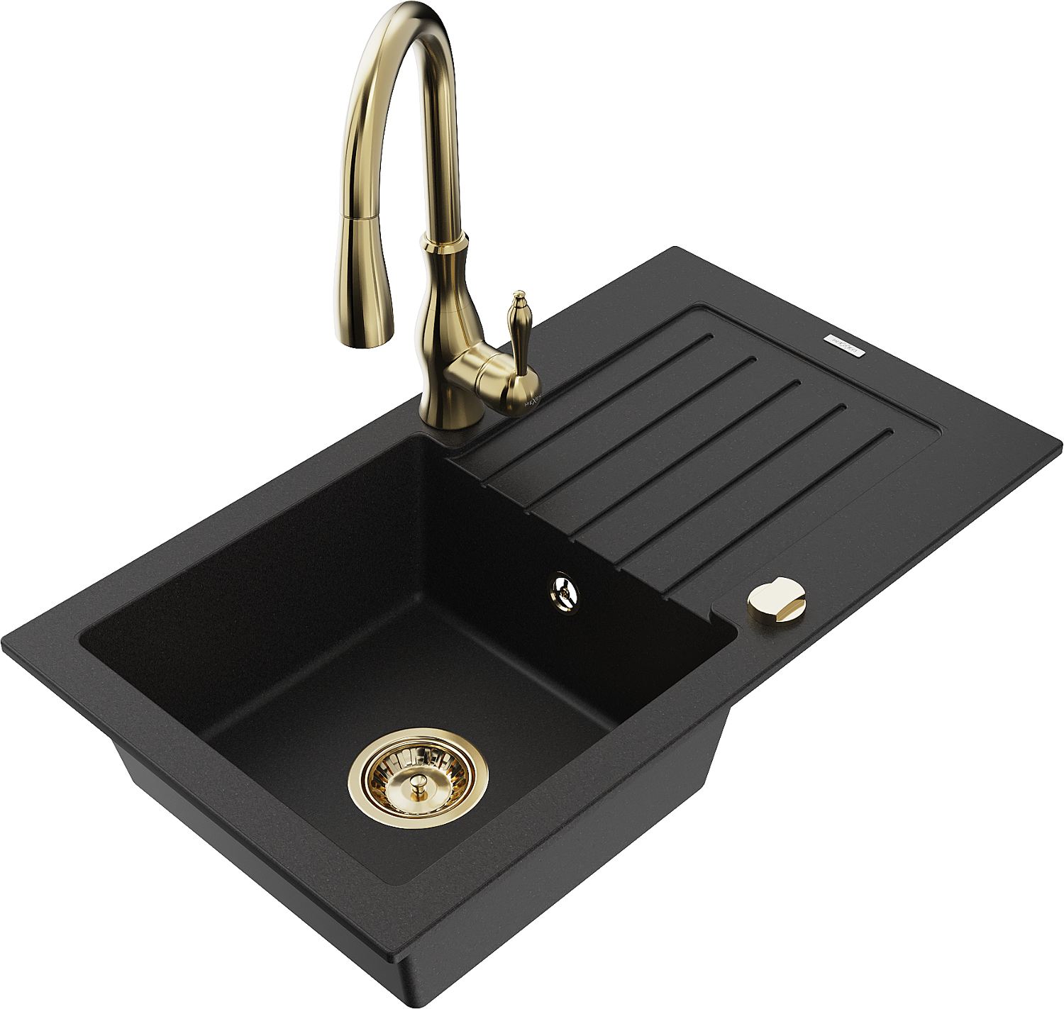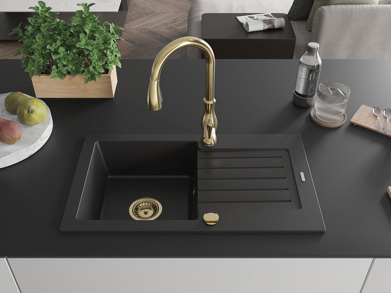 Mexen Pablo évier en granit 1 bac avec égouttoir et robinet de cuisine Savita, noir - 6510-77-672601-50