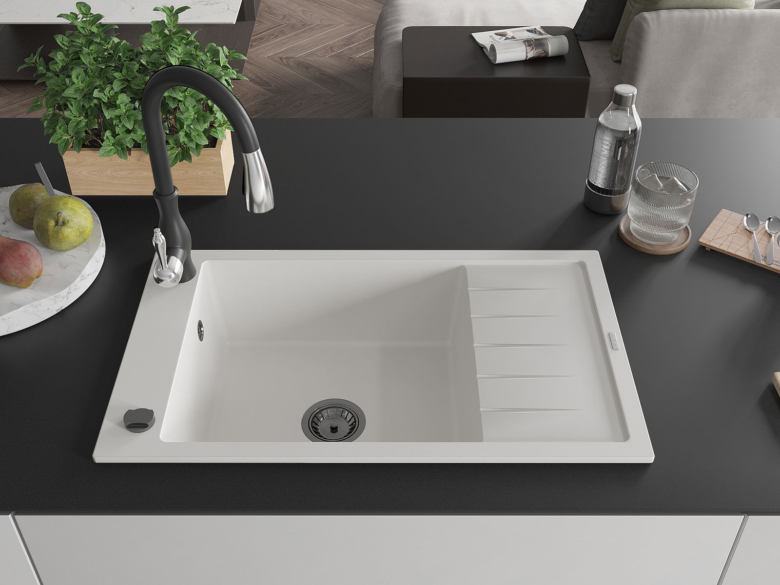 Mexen Elias évier de cuisine en granit 1 bac avec égouttoir et robinet de cuisine Savita, blanc - 6511-20-672601-70