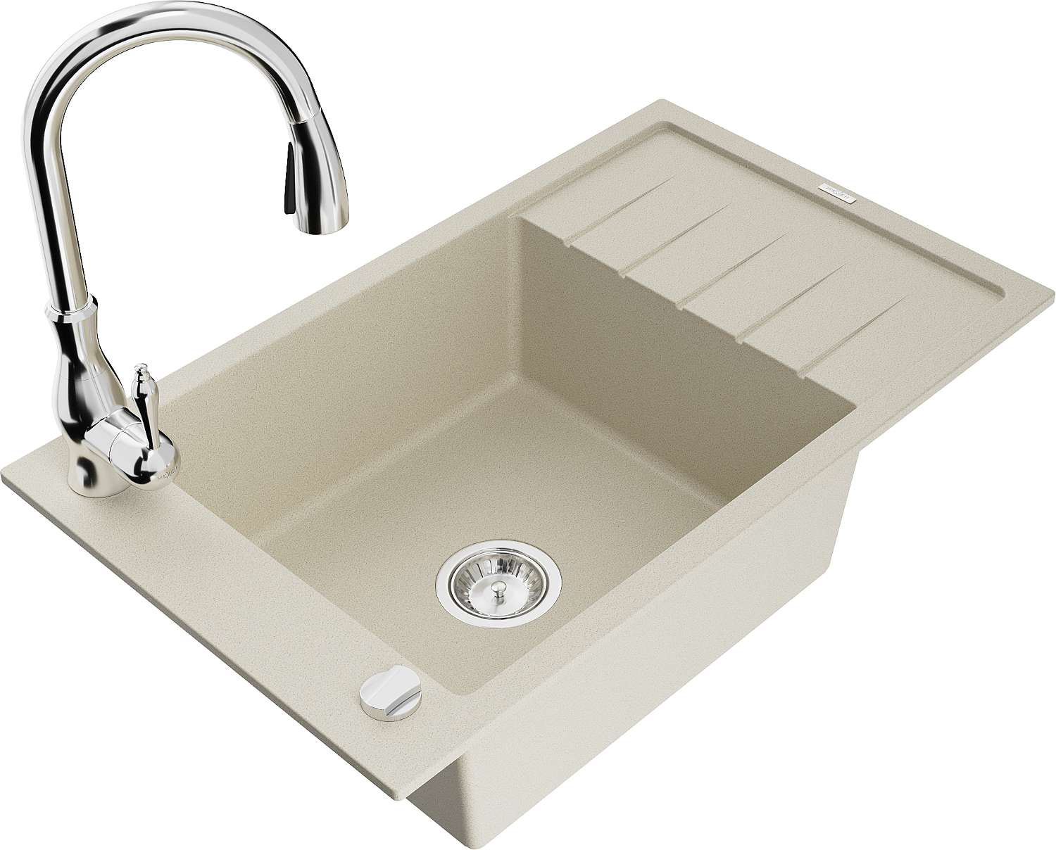 Mexen Elias évier en granit à 1 bac avec égouttoir et robinet de cuisine Savita, beige - 6511-69-672601-00