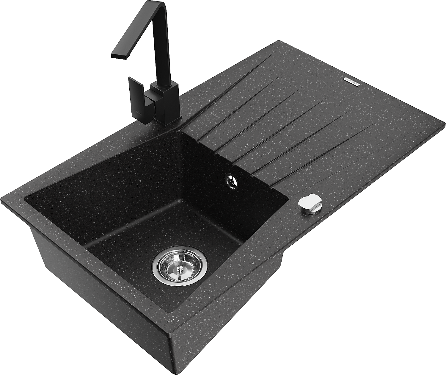 Mexen Cesar évier en granit 1 bac avec égouttoir et mitigeur de cuisine Rita, noir/métallique argent - 6514-73-670300-70