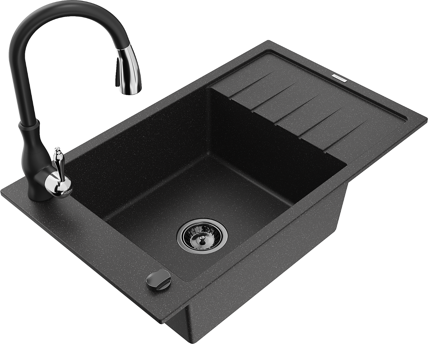Mexen Elias évier en granit 1 bac avec égouttoir et robinet de cuisine Savita, noir/argent métallique - 6511-73-672601-70-B