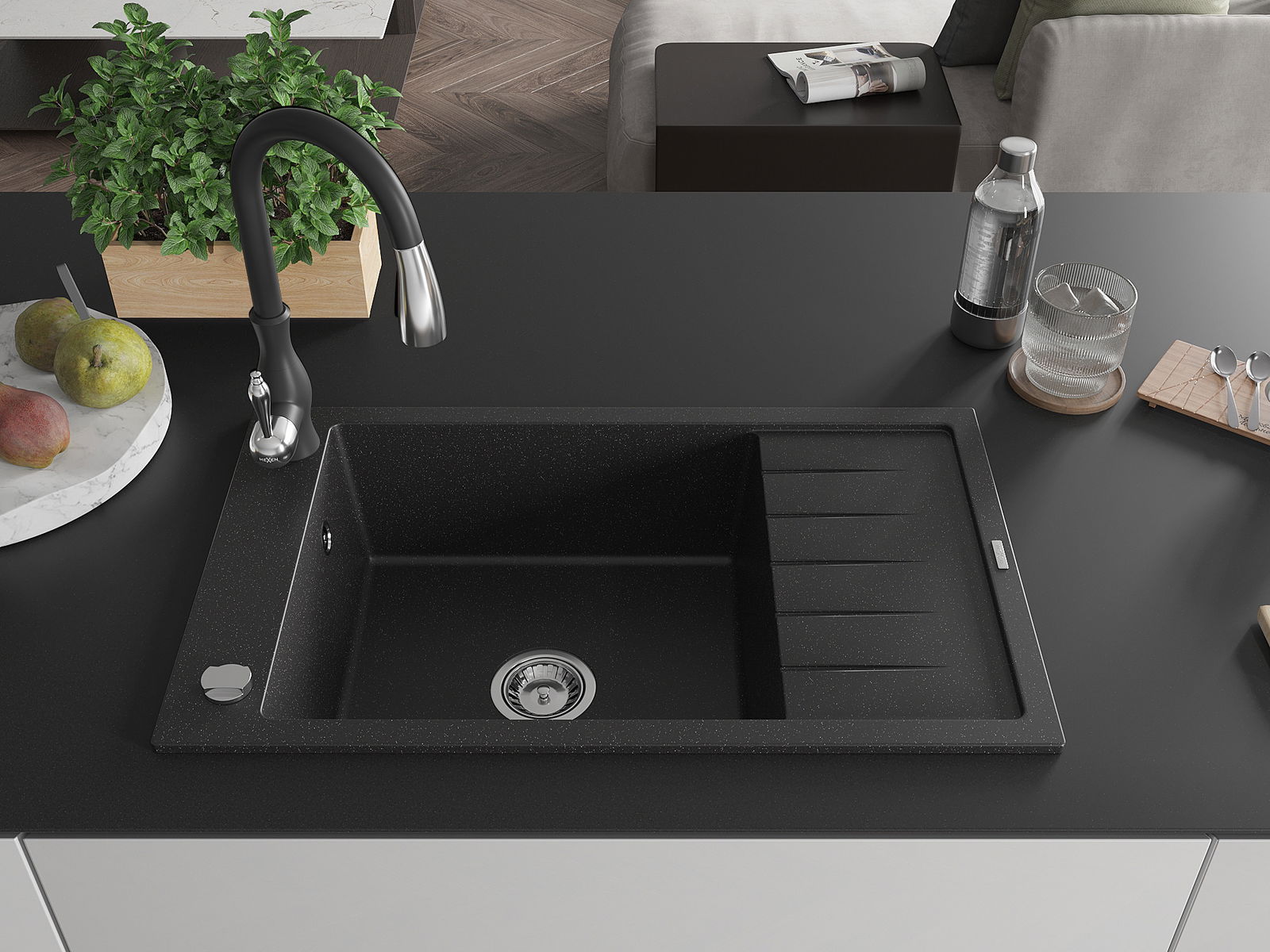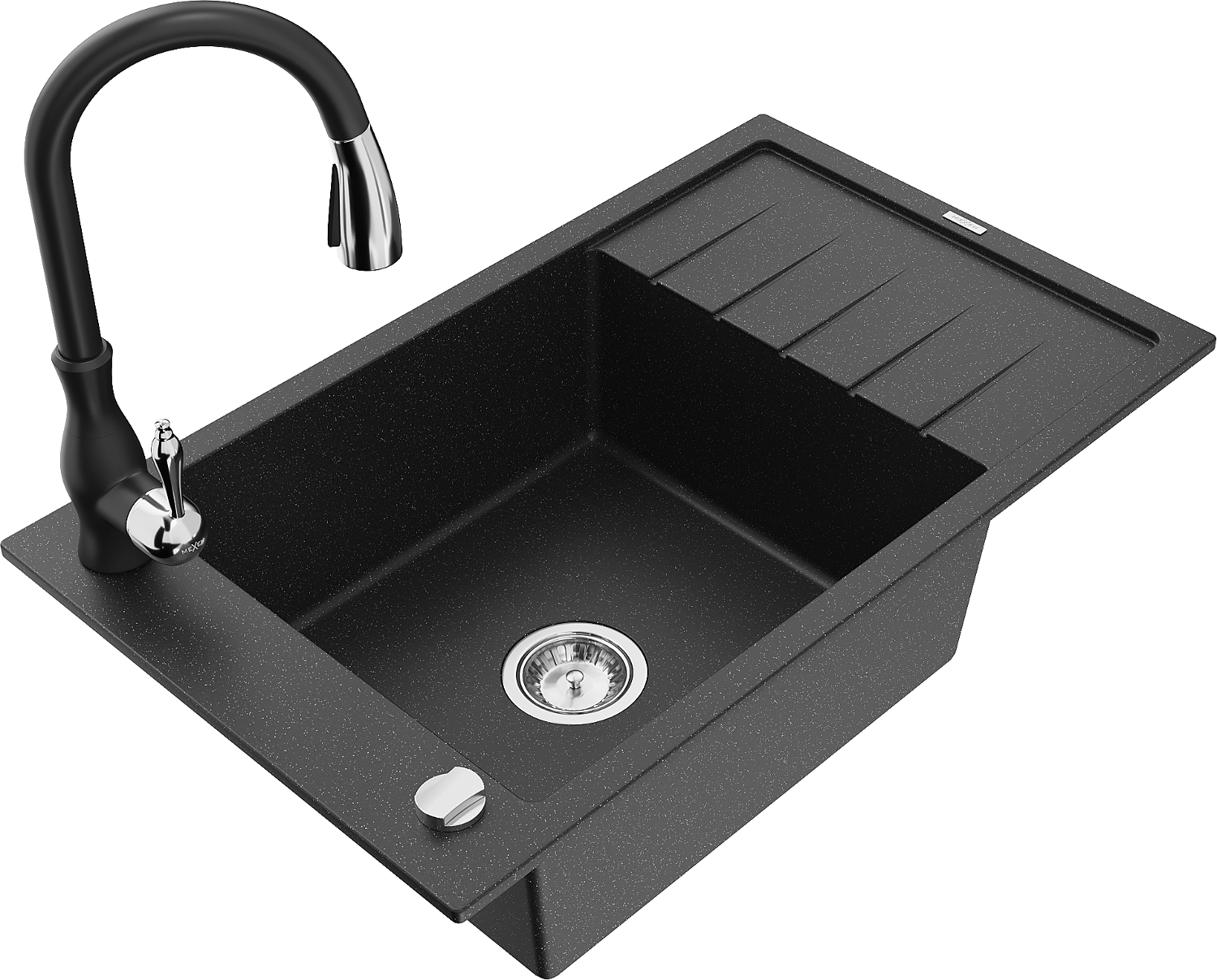 Mexen Elias évier en granit à 1 bac avec égouttoir et mitigeur de cuisine Savita, noir/métallisé argent- 6511-73-672601-70