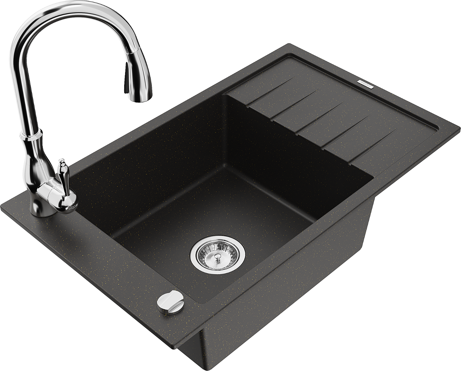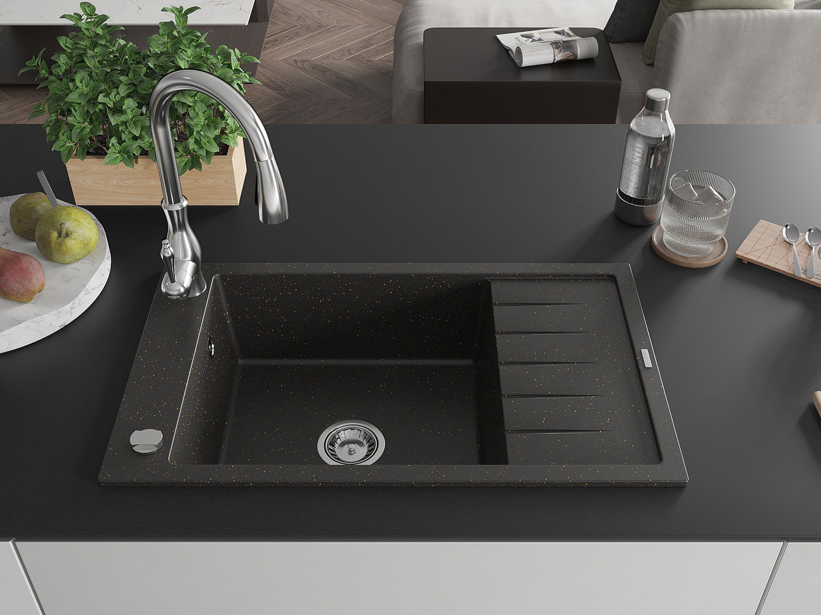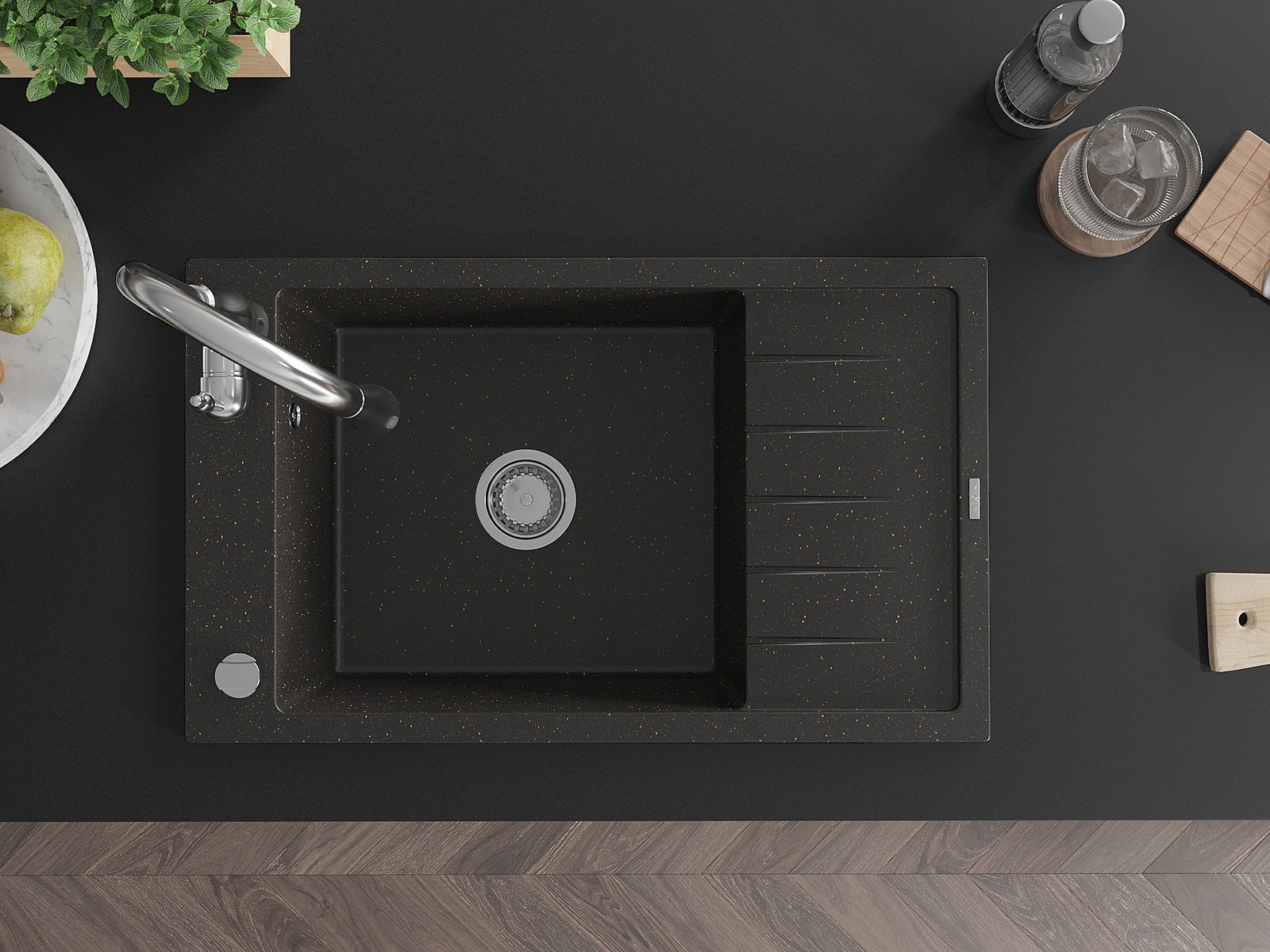 Mexen Elias évier en granit 1 bac avec égouttoir et robinet de cuisine Savita, noir/or métallique- 6511-75-672601-00