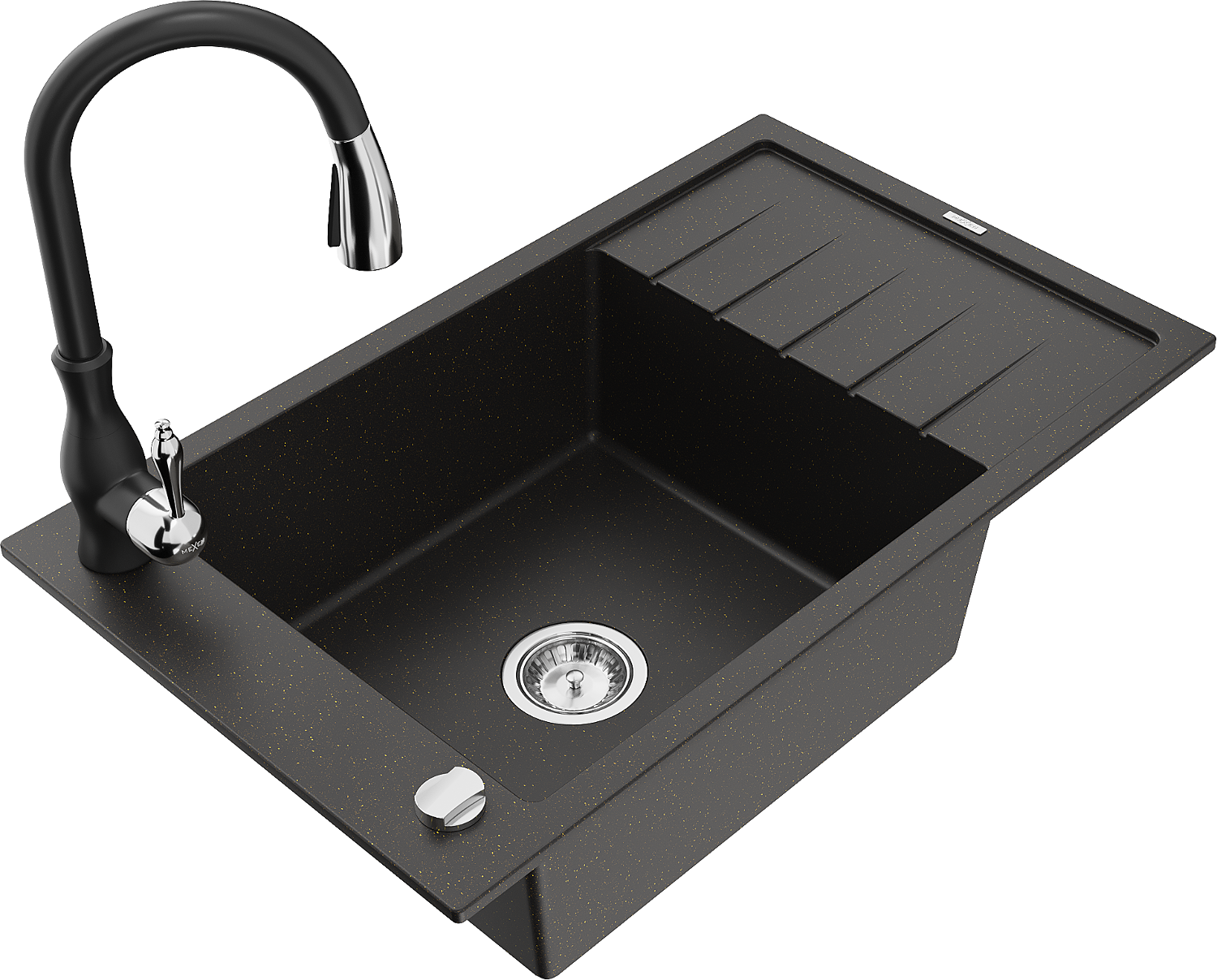 Mexen Elias évier en granit 1 bac avec égouttoir et robinet de cuisine Savita, noir/doré métallisé - 6511-75-672601-70
