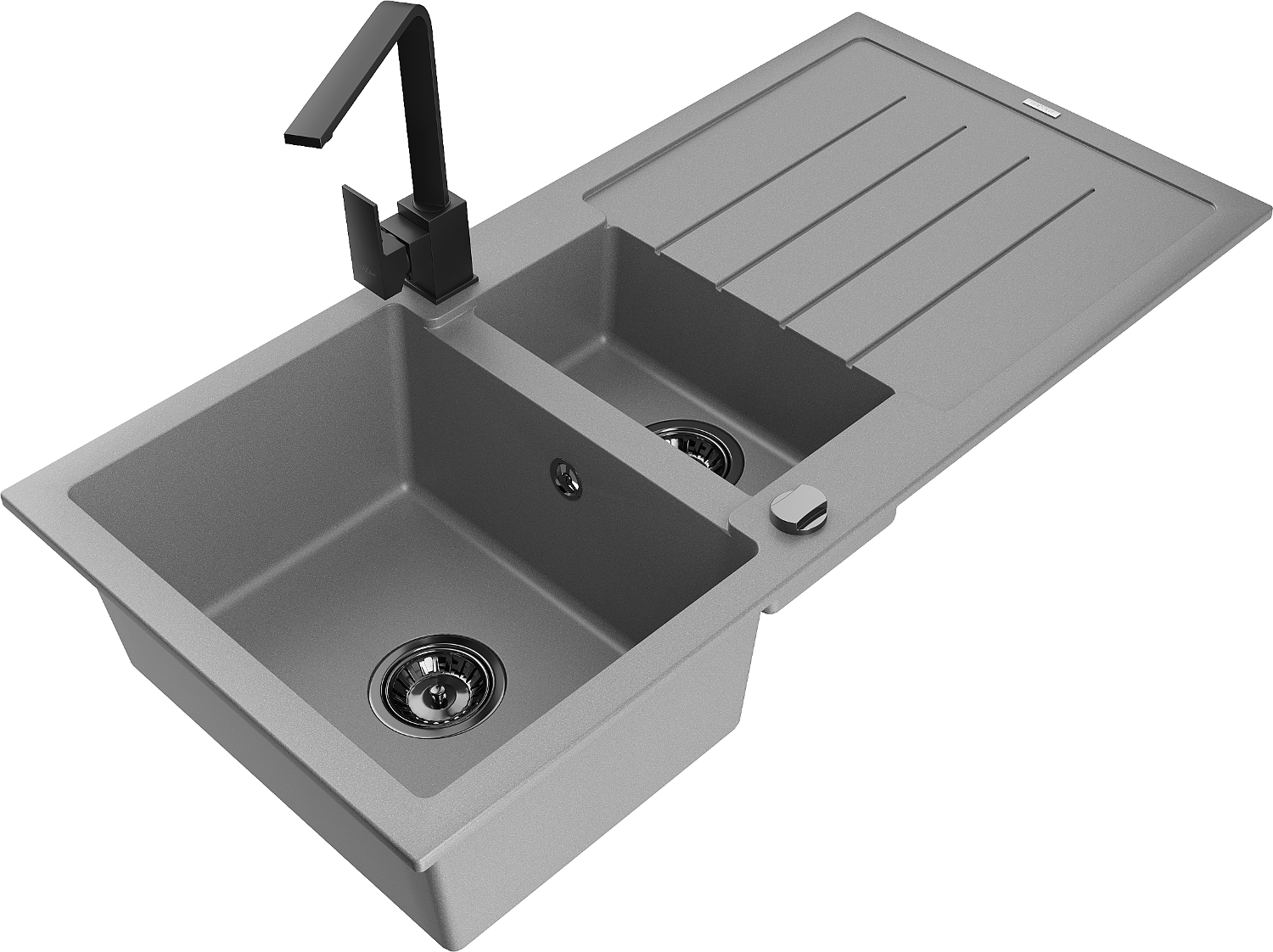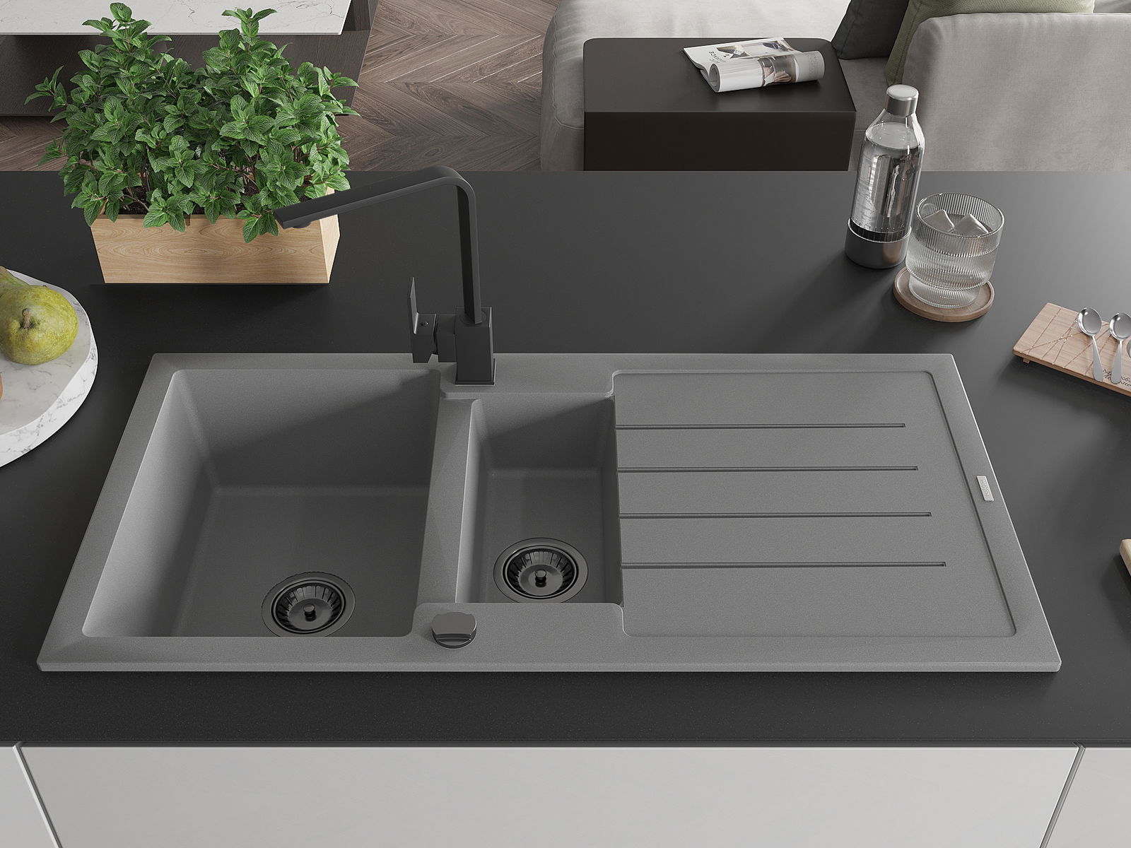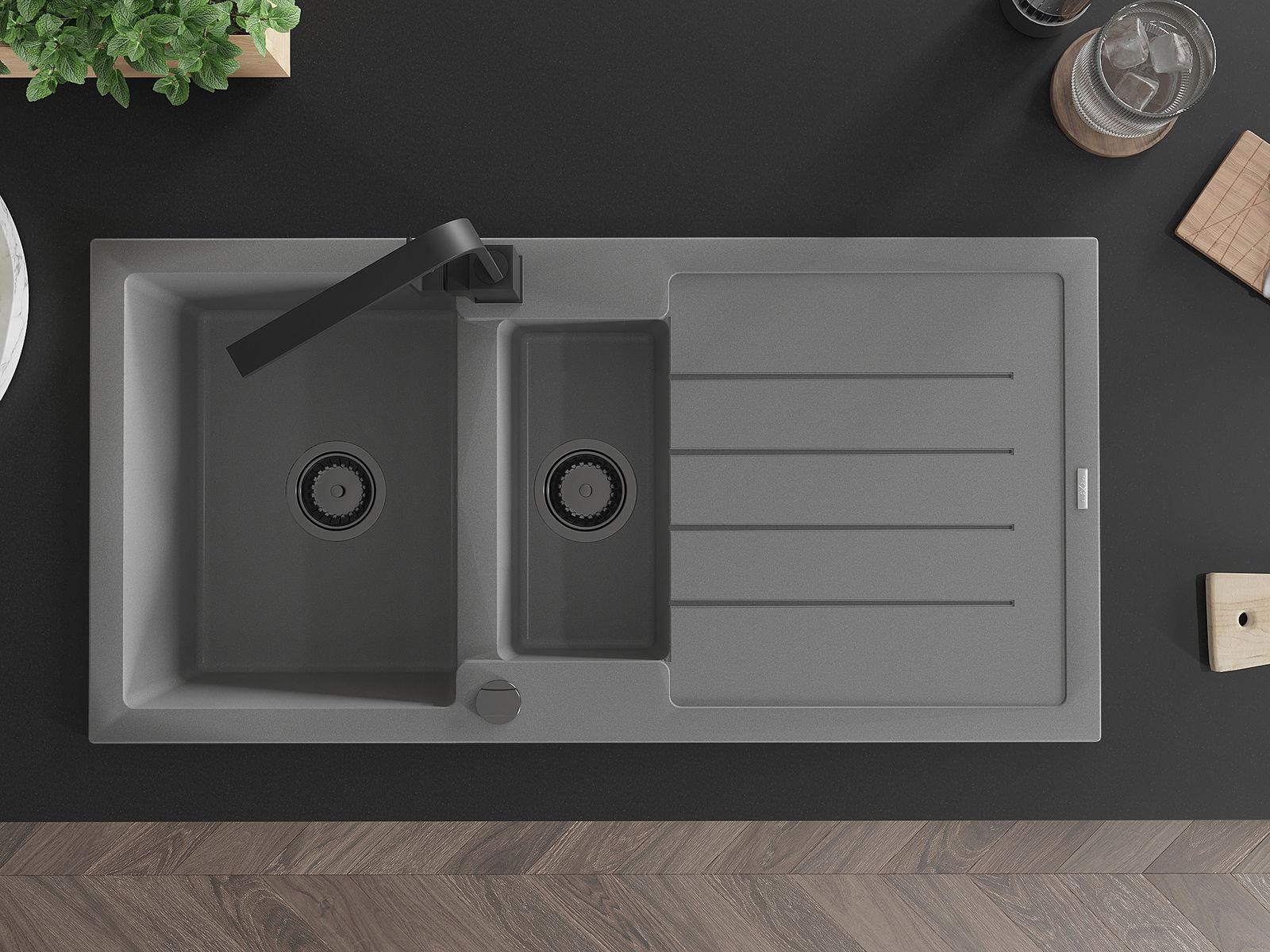 Mexen Andres évier en granit 1,5 bac avec égouttoir et mitigeur de cuisine Rita, gris - 6515-71-670300-70-B