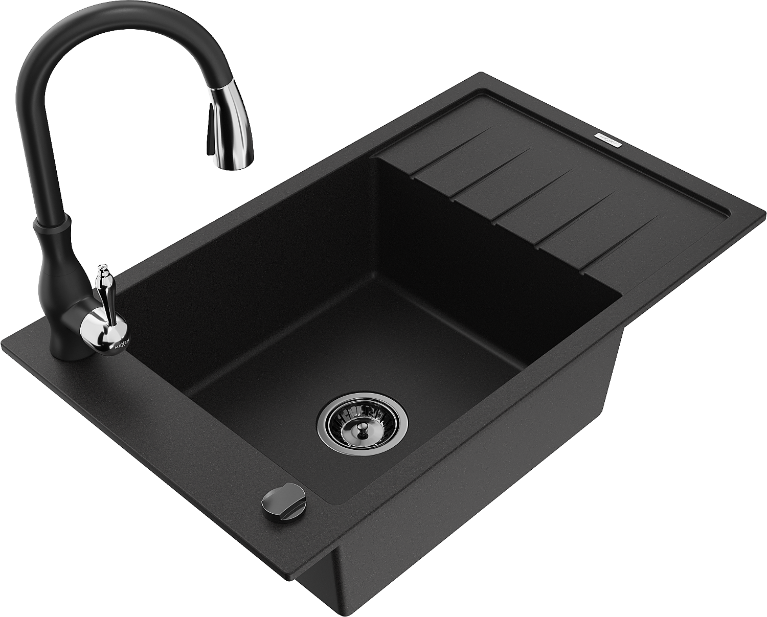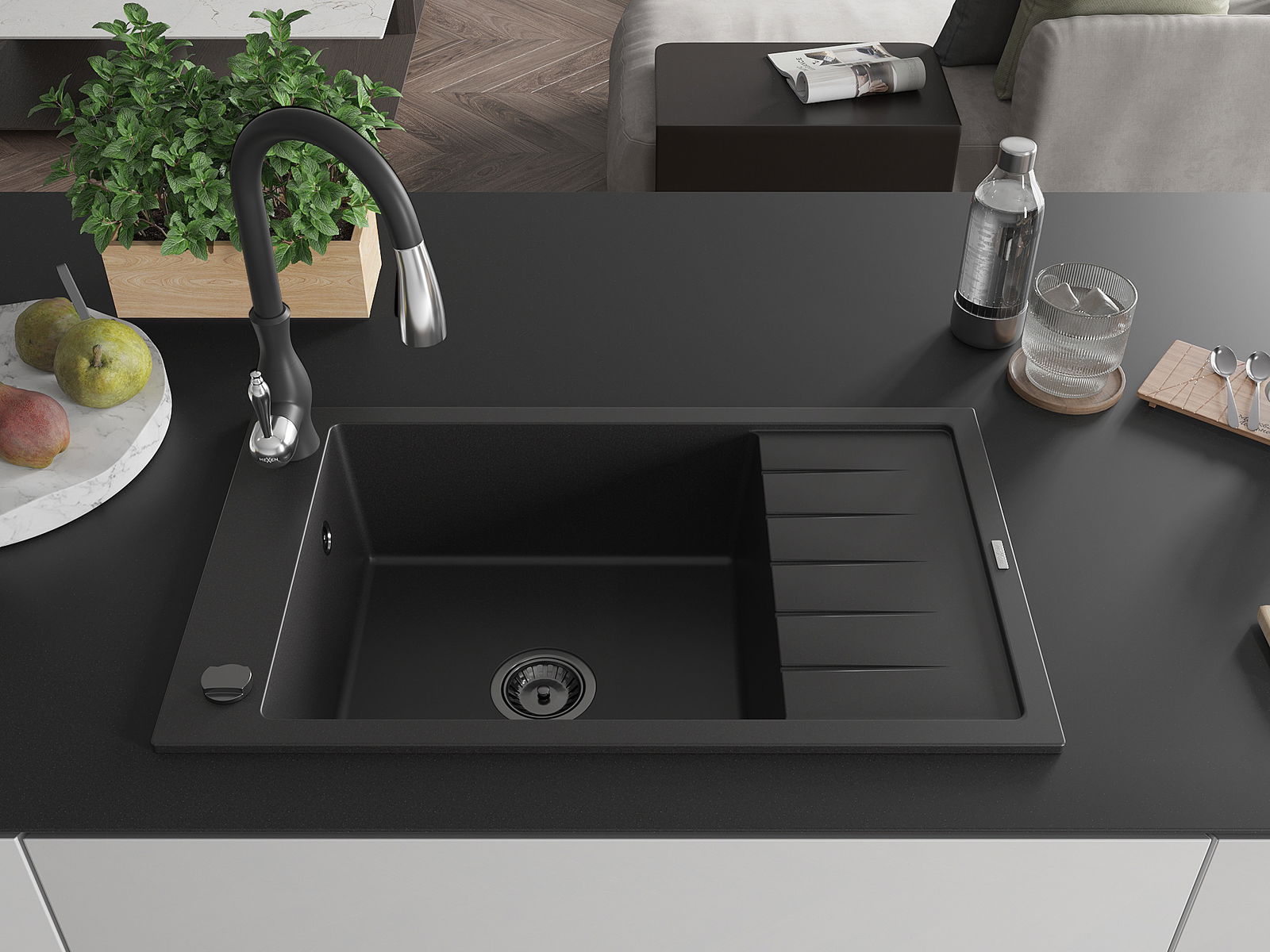Mexen Elias évier en granit 1 bac avec égouttoir et mitigeur de cuisine Savita, noir - 6511-77-672601-70-B