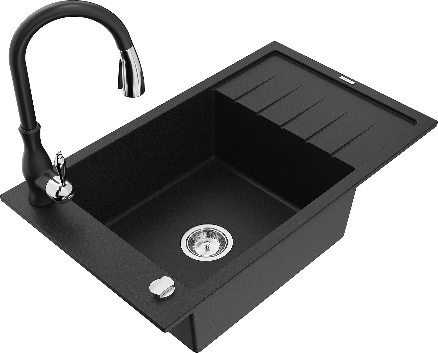 Mexen Elias évier granitique 1-bac avec égouttoir et robinet de cuisine Savita, noir - 6511-77-672601-70