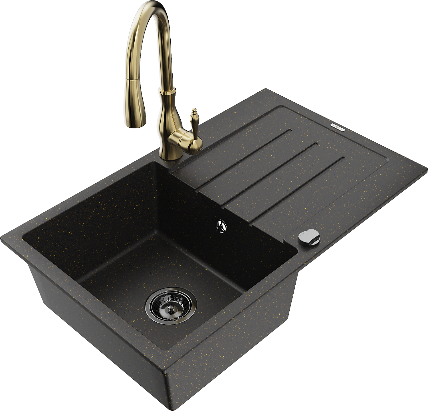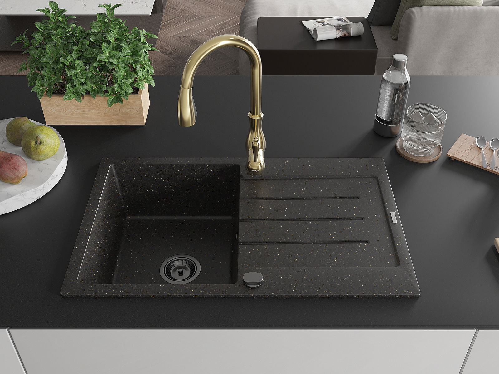Mexen Bruno évier en granit 1 bac avec égouttoir et robinet de cuisine Savita, noir/or métallique - 6513-75-672601-50-B