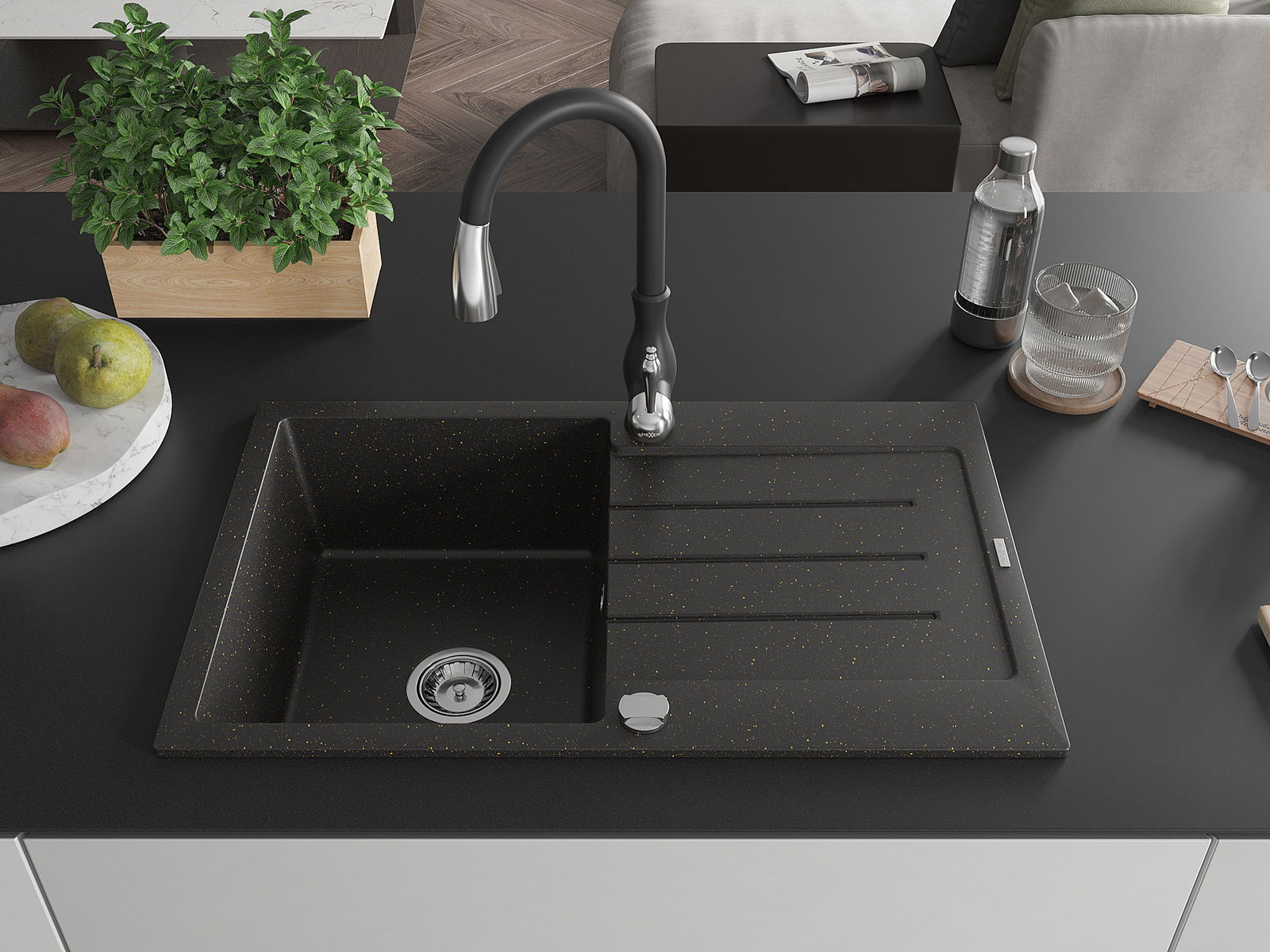 Mexen Bruno évier en granit 1 bac avec égouttoir et mitigeur d'évier Savita, noir/or métallique - 6513-75-672601-70