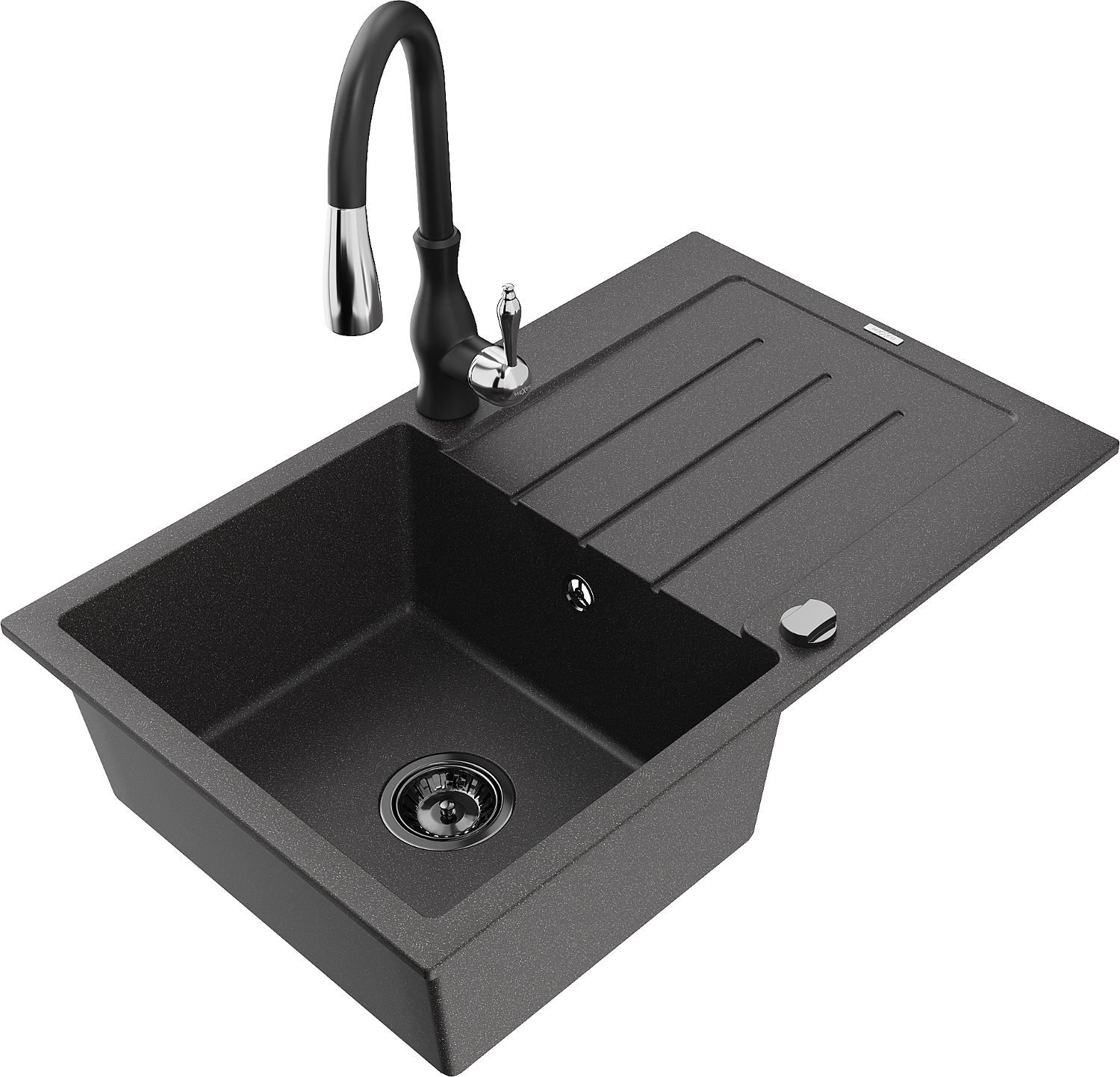 Mexen Bruno évier de cuisine en granit 1 bac avec égouttoir et robinetterie Savita, noir moucheté - 6513-76-672601-70-B