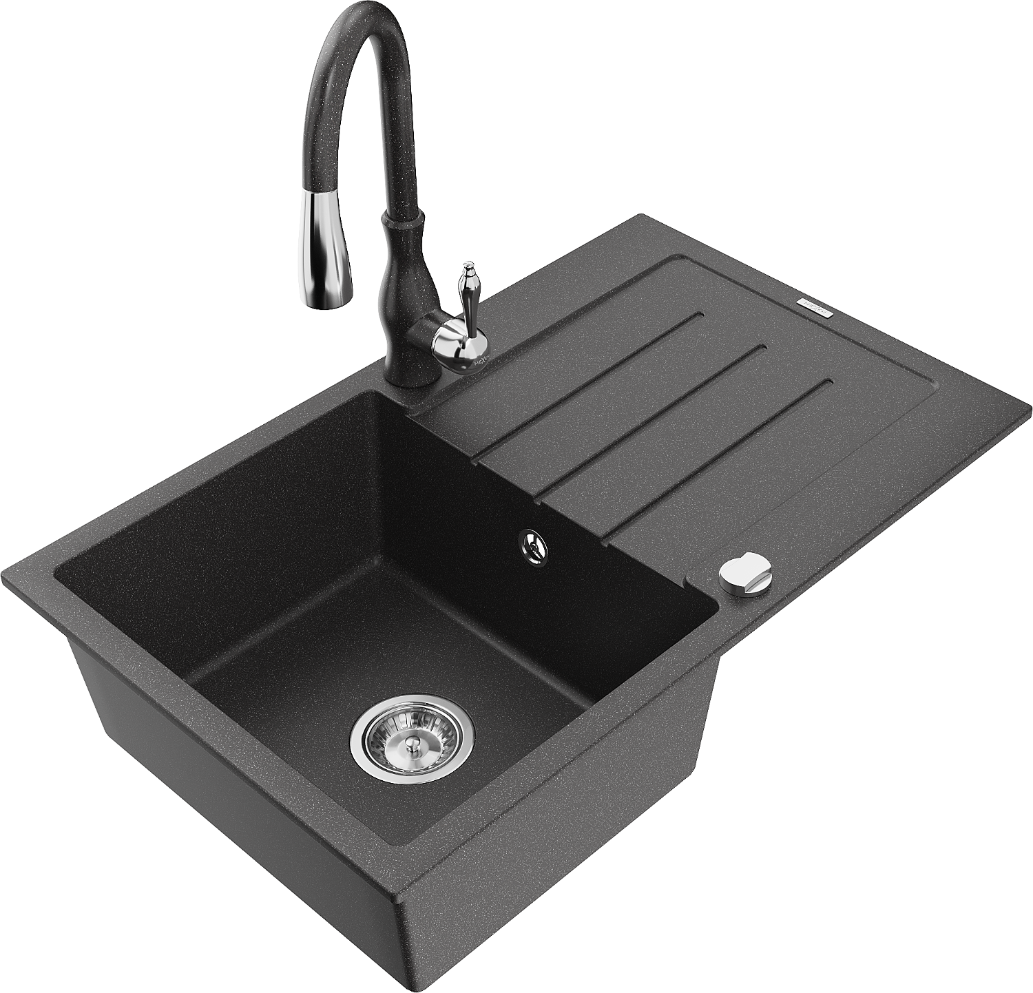 Mexen Bruno évier de cuisine en granit 1 bac avec égouttoir et robinet de cuisine Savita, noir moucheté - 6513-76-672601-76