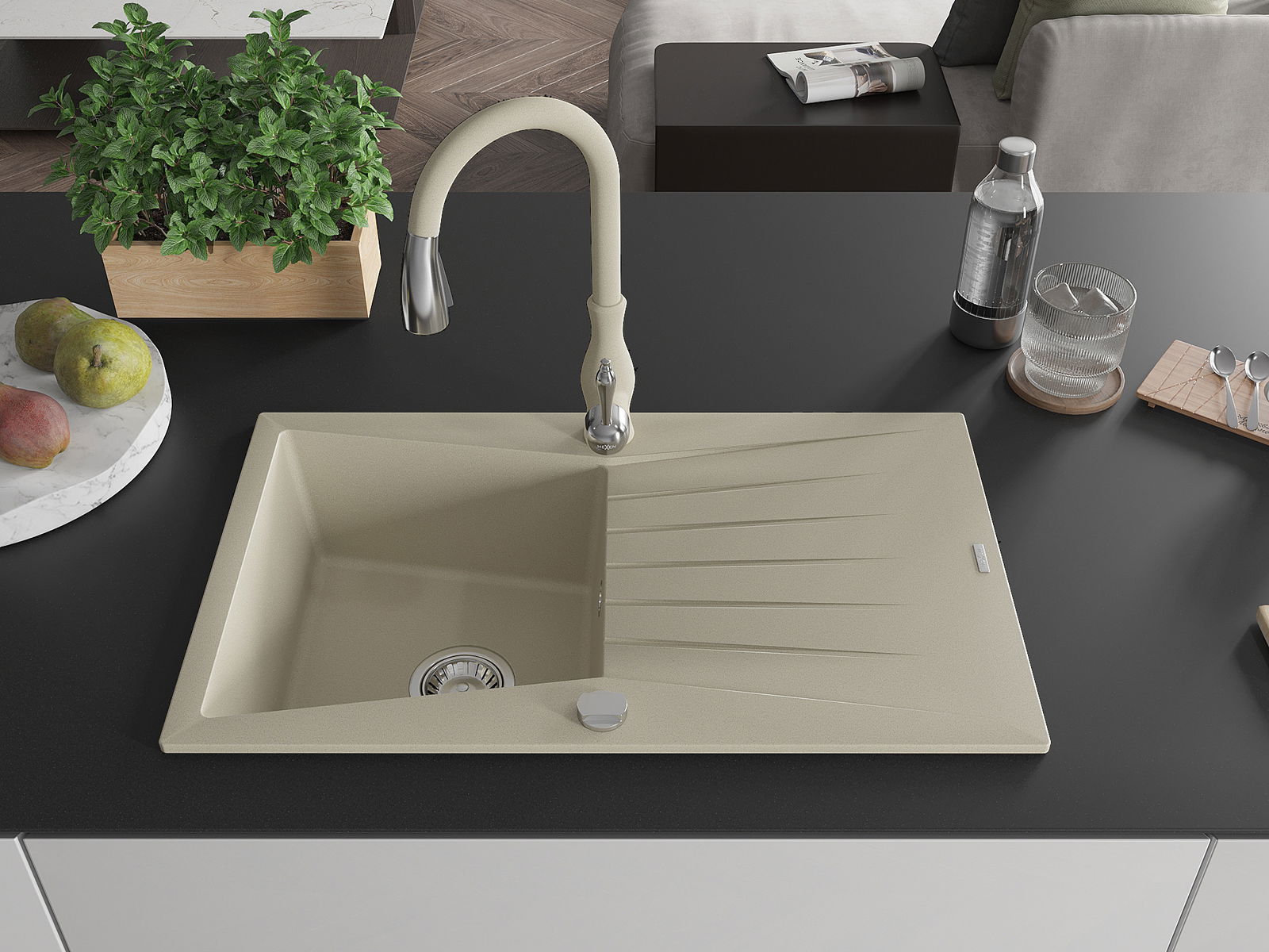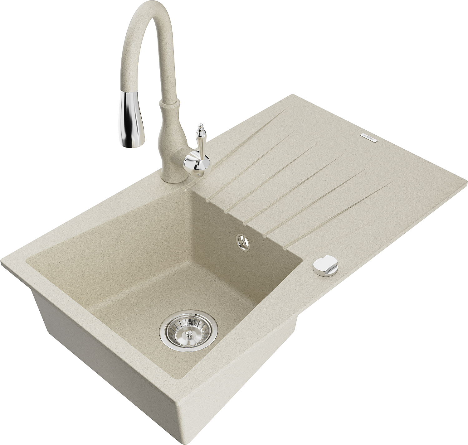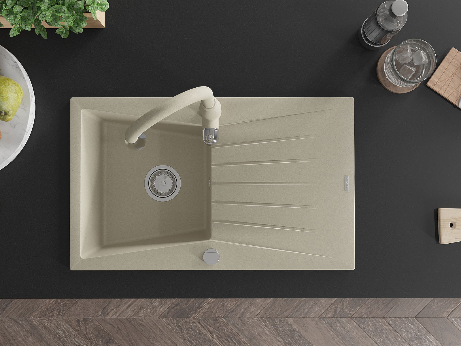 Mexen Cesar évier en granit 1 bac avec égouttoir et robinet de cuisine Savita, beige - 6514-69-672601-69