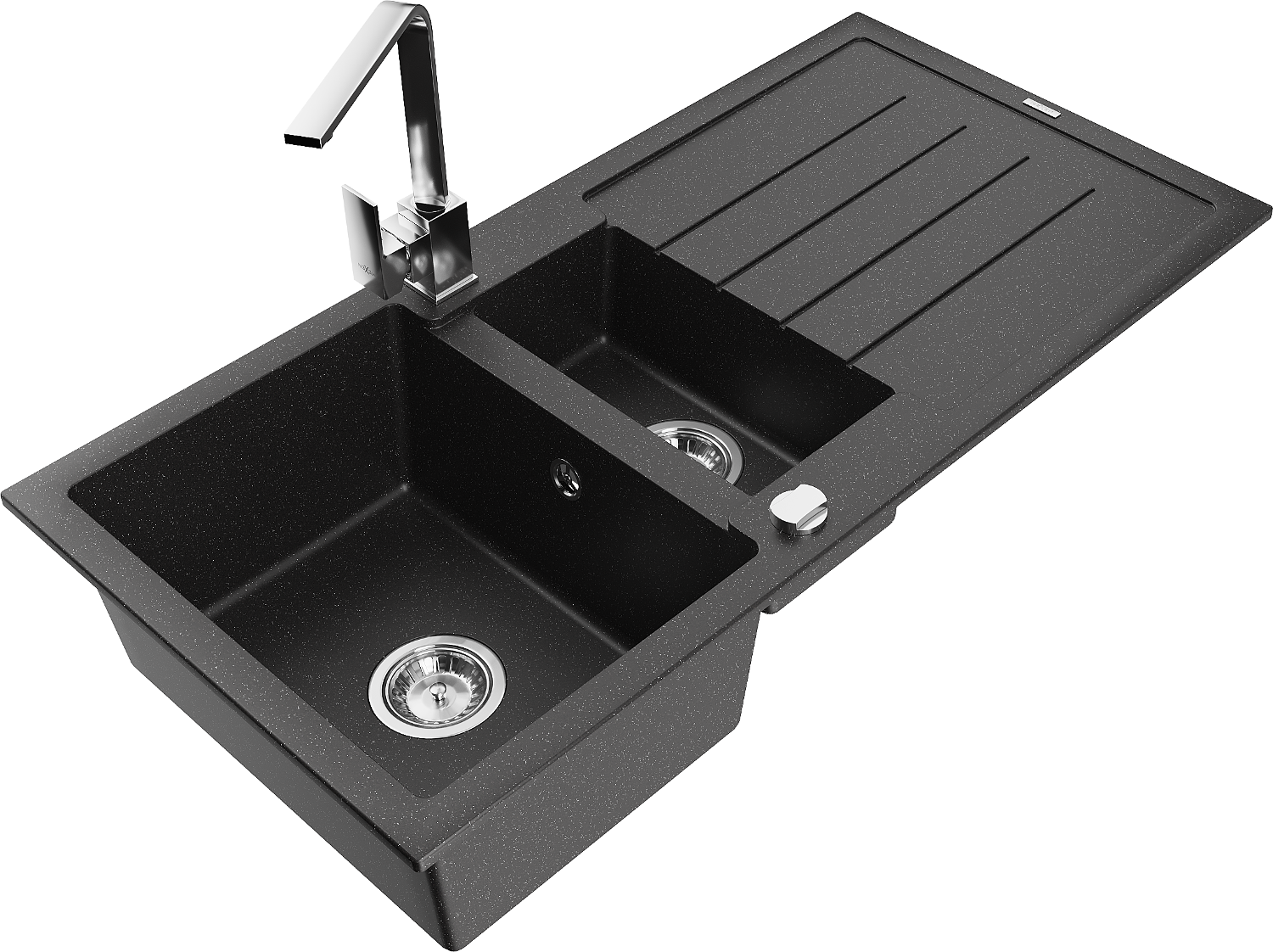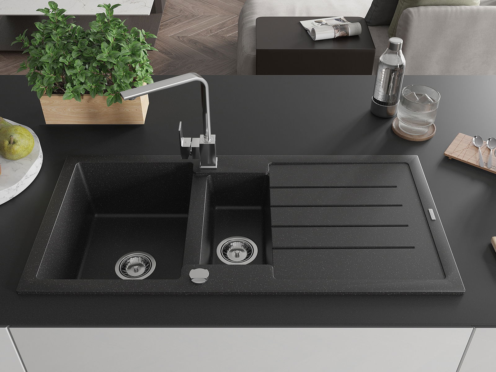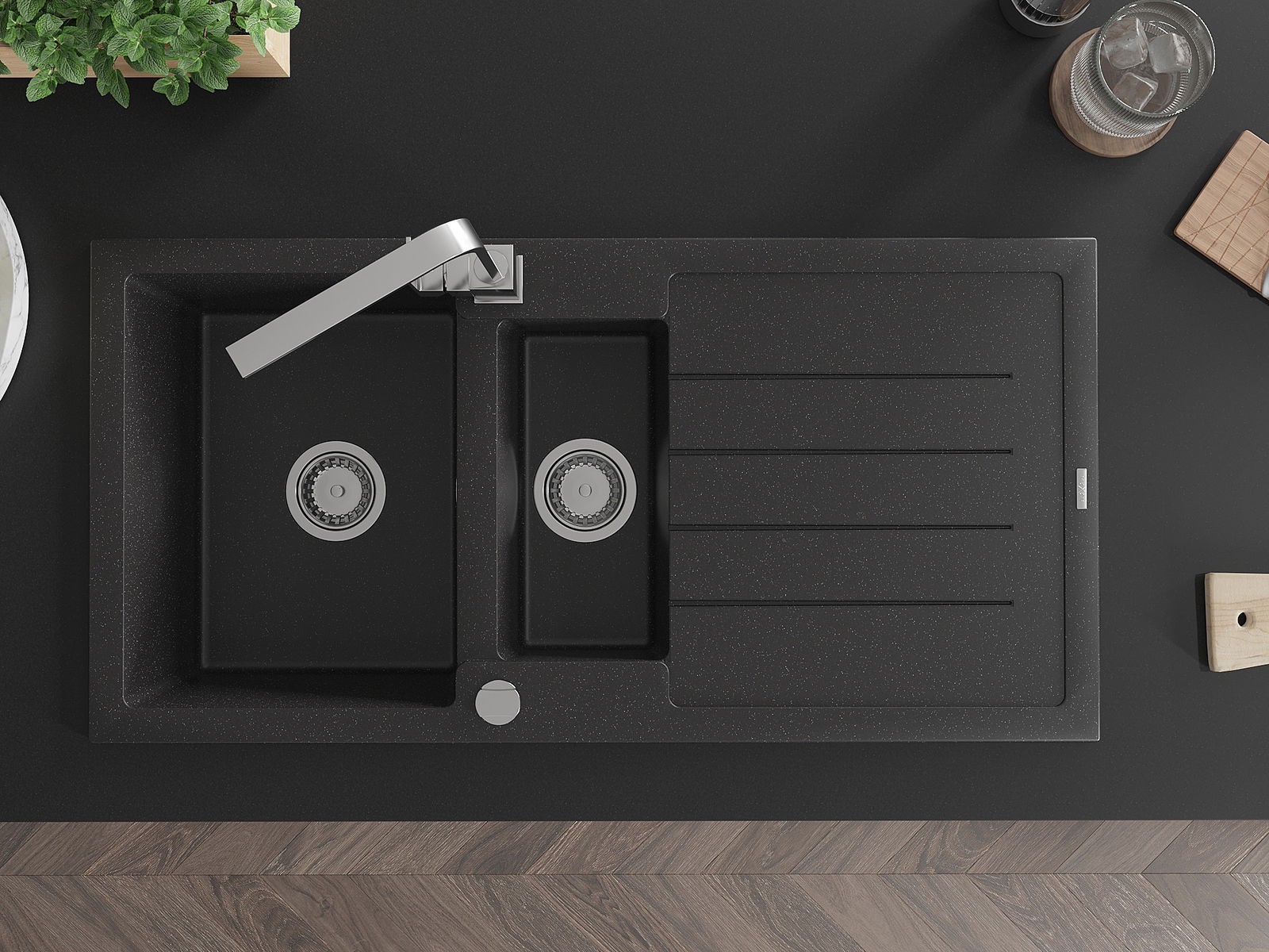 Mexen Andres évier en granit 1,5 bac avec égouttoir et robinet de cuisine Rita, noir/métallisé argent - 6515-73-670300-00