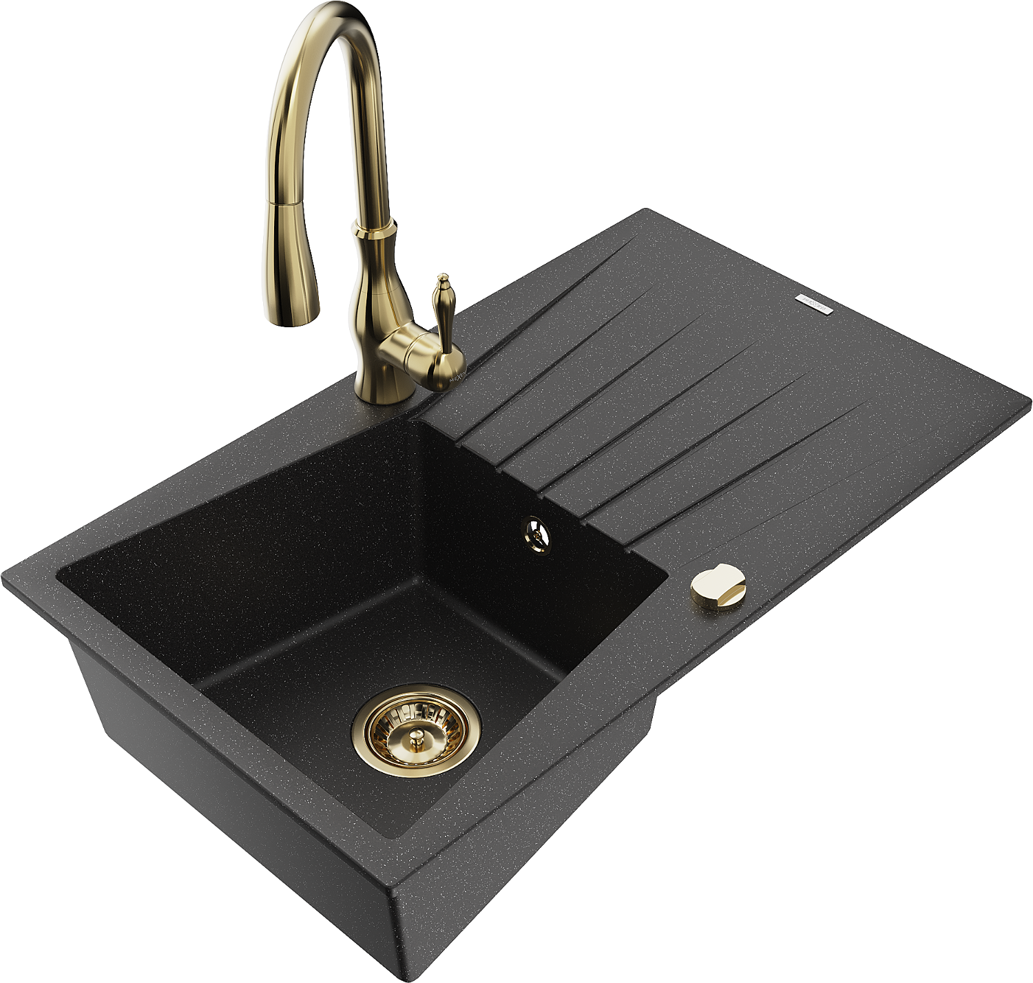 Mexen Cesar évier en granit 1 bac avec égouttoir et robinet de cuisine Savita, noir/argent métallisé - 6514-73-672601-50