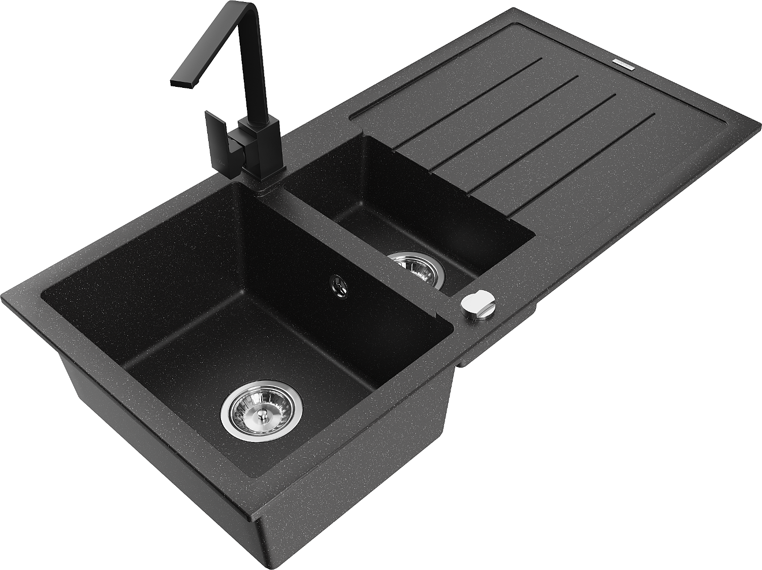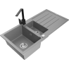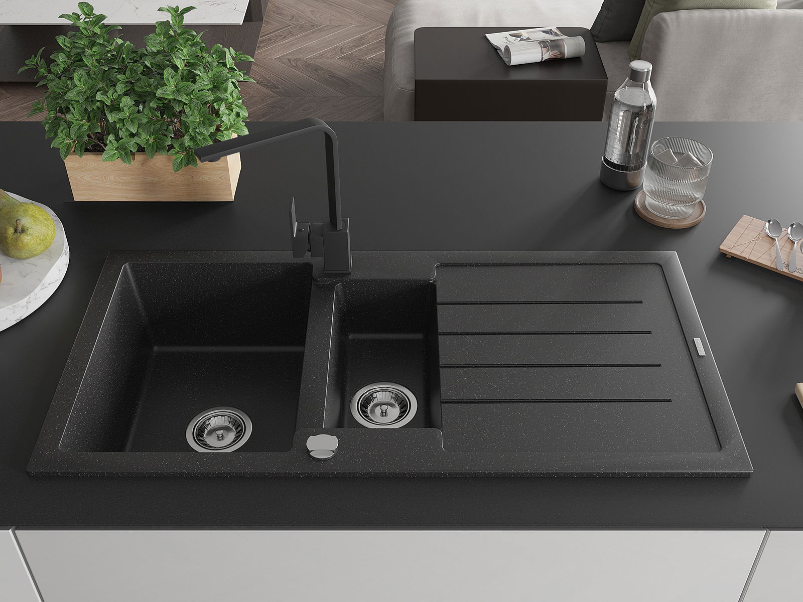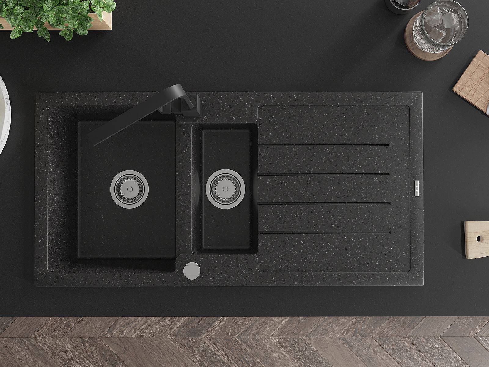 Mexen Andres évier en granit 1,5 bac avec égouttoir et robinet de cuisine Rita, noir/métallique argenté - 6515-73-670300-70