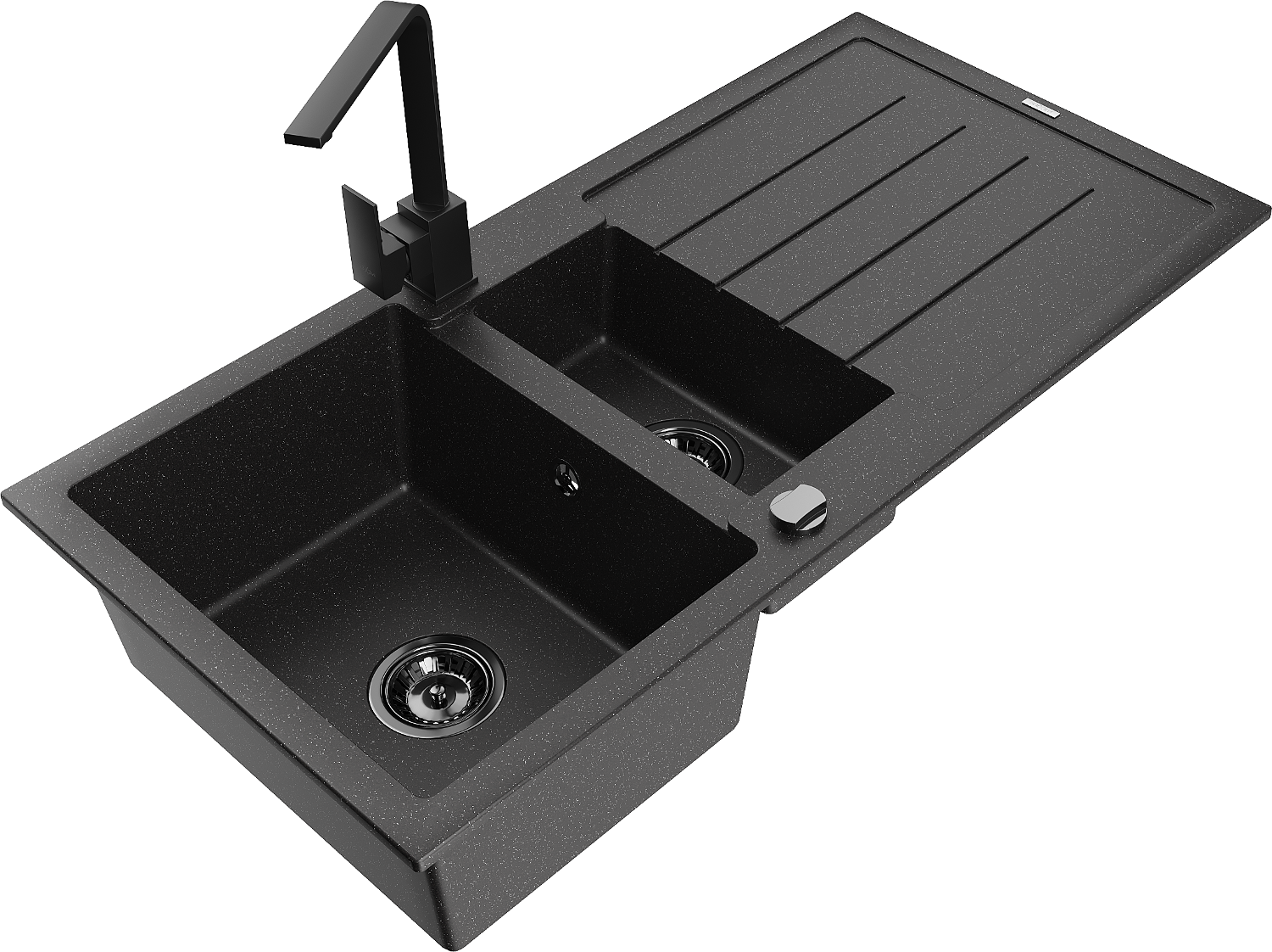 Mexen Andres évier en granit 1,5 bac avec égouttoir et mitigeur de cuisine Rita, noir/argent - 6515-73-670300-70-B
