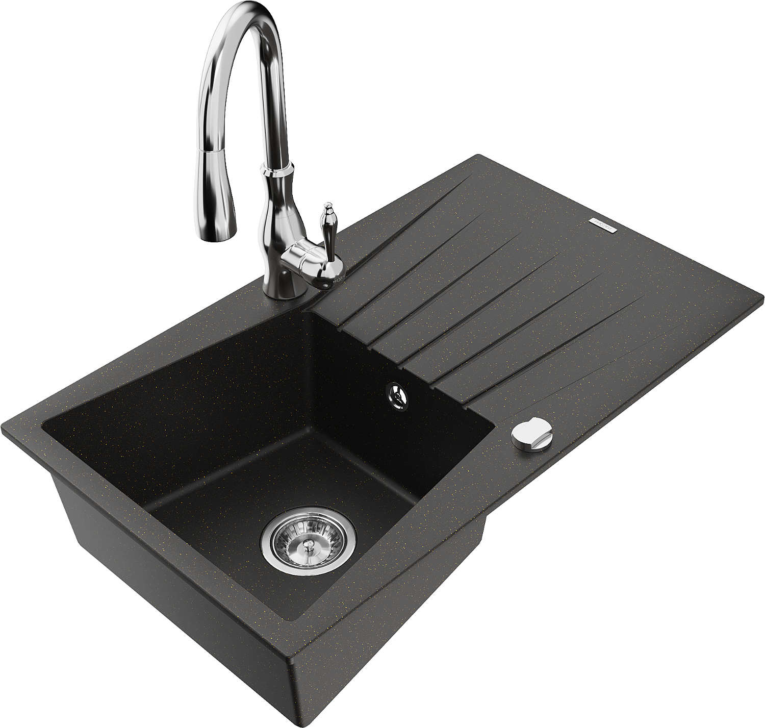 Mexen Cesar évier de cuisine en granit 1 bac avec égouttoir et robinet de cuisine Savita, noir/doré métallisé - 6514-75-672601-?