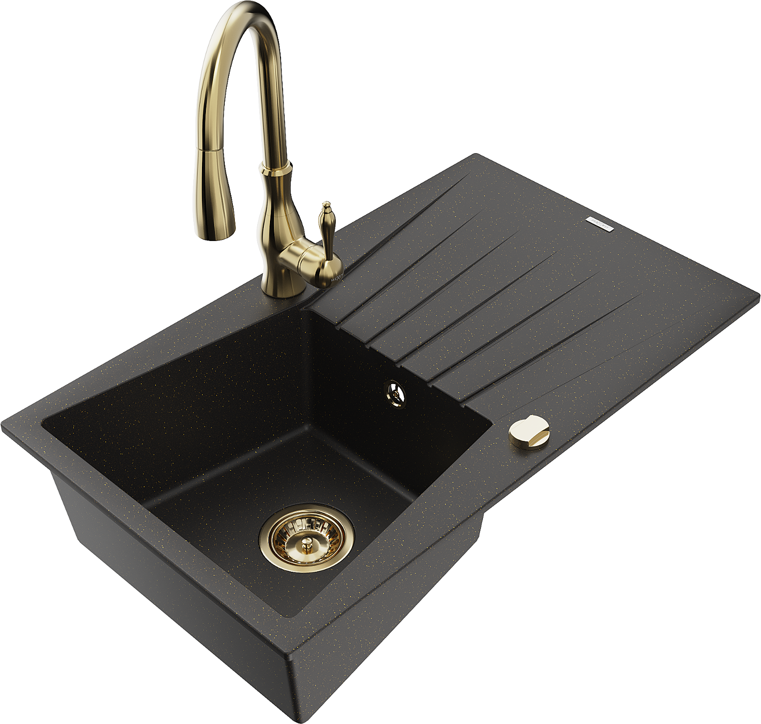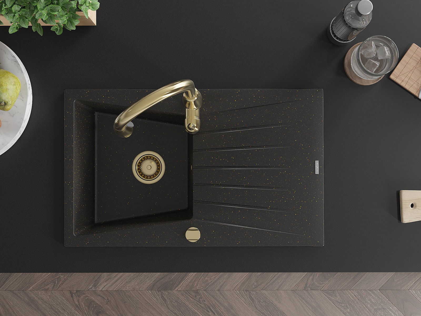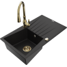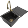 Mexen Cesar évier en granit 1 bac avec égouttoir et robinet de cuisine Savita, noir/métal doré - 6514-75-672601-50