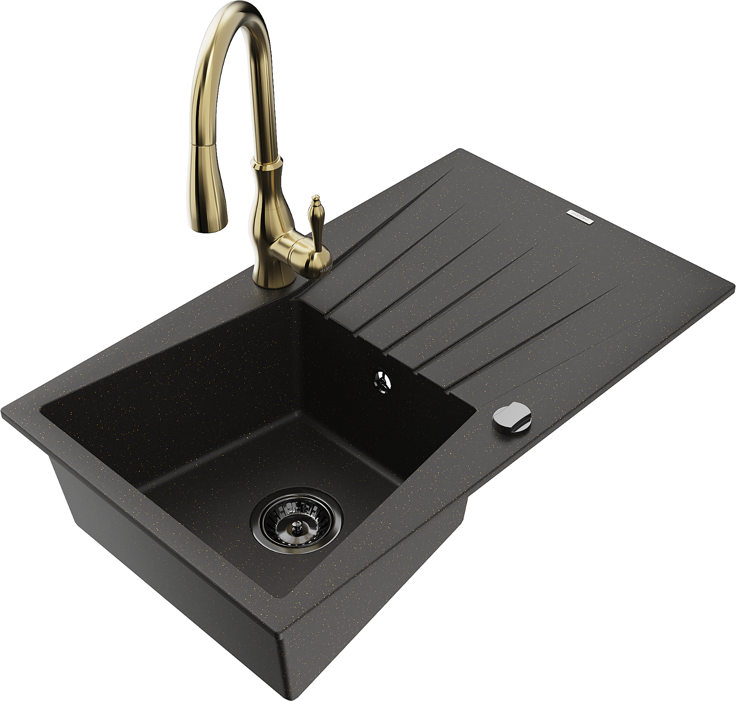 Mexen Cesar évier en granit 1 bac avec égouttoir et robinet de cuisine Savita, noir/doré métallique - 6514-75-672601-50-B