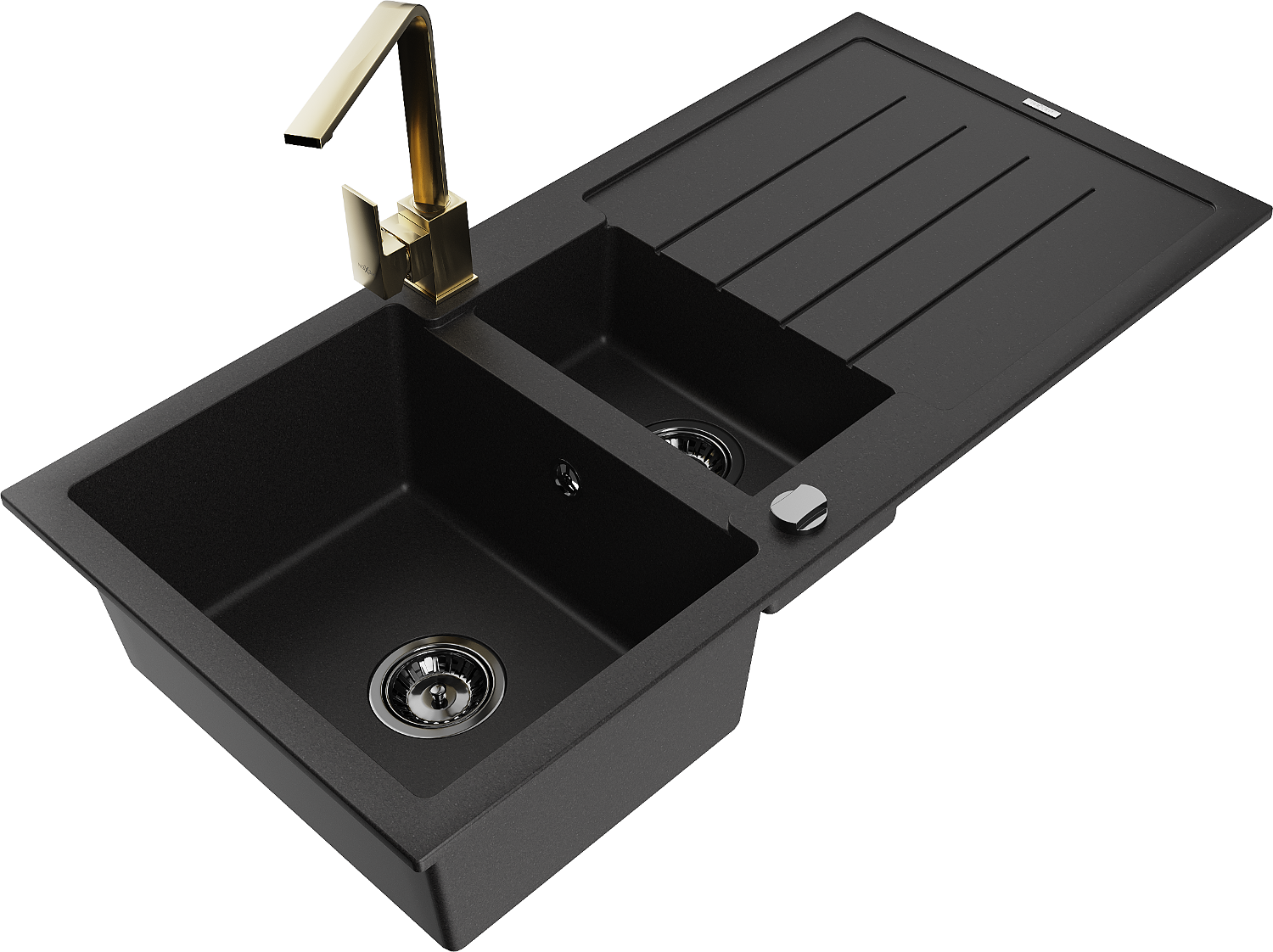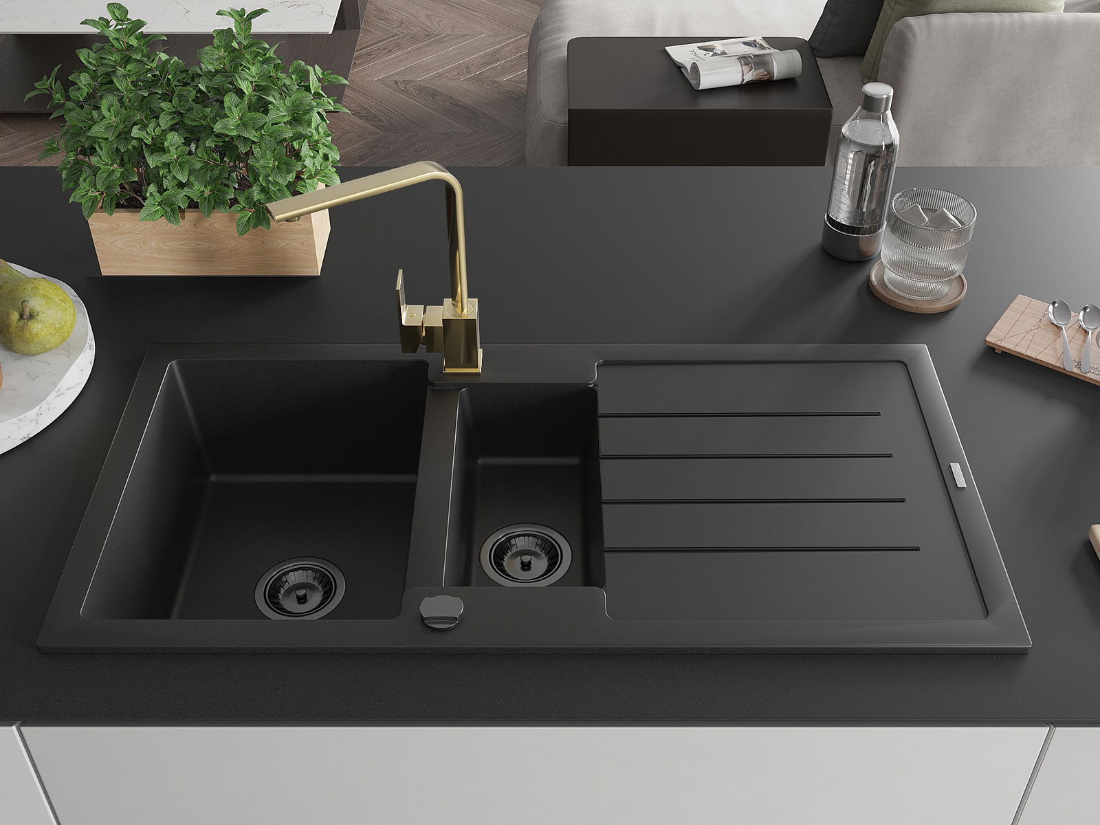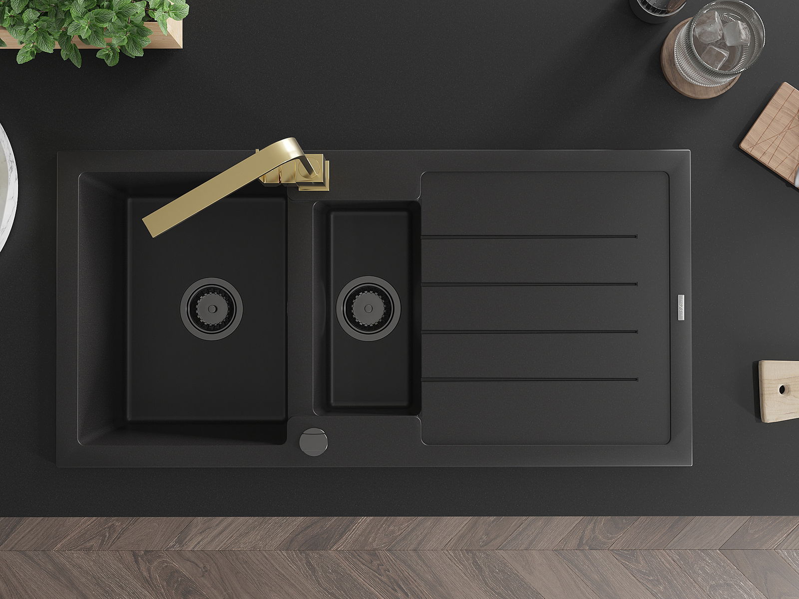 Mexen Andres évier en granit 1,5 bac avec égouttoir et robinet de cuisine Rita, noir/or métallique- 6515-75-670300-50-B