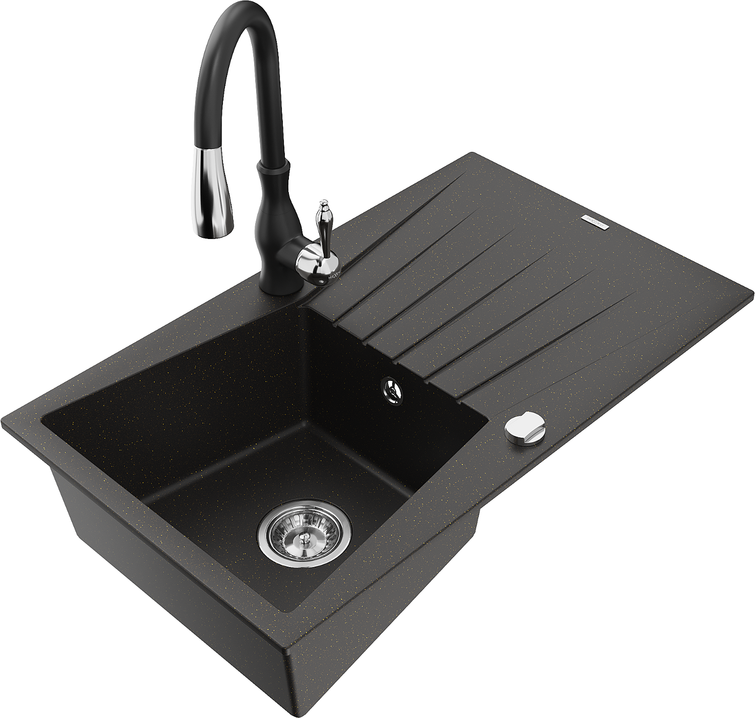 Mexen Cesar évier en granit 1 bac avec égouttoir et robinet de cuisine Savita, noir/or métallisé - 6514-75-672601-70