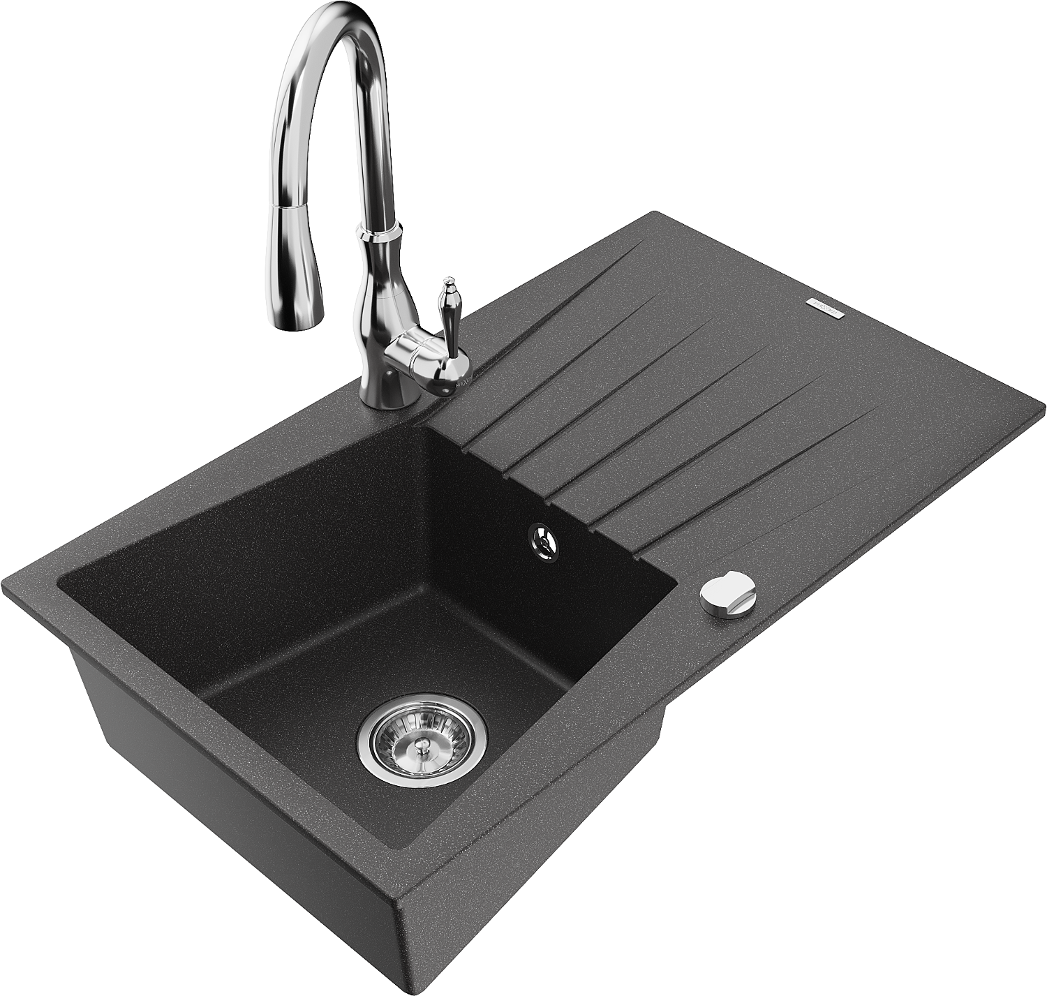 Mexen Cesar évier en granit à 1 bac avec égouttoir et robinet de cuisine Savita, noir moucheté - 6514-76-672601-00