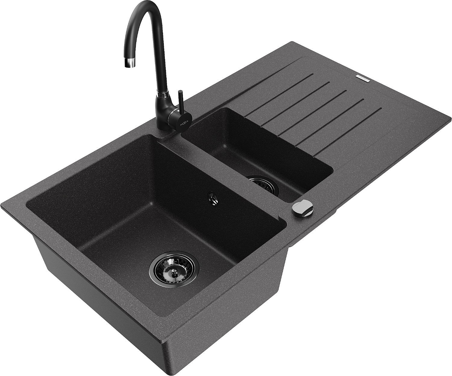 Mexen Matias évier en granit 1,5 bac avec égouttoir et robinet de cuisine Telma, noir moucheté - 6502-76-670200-70-B
