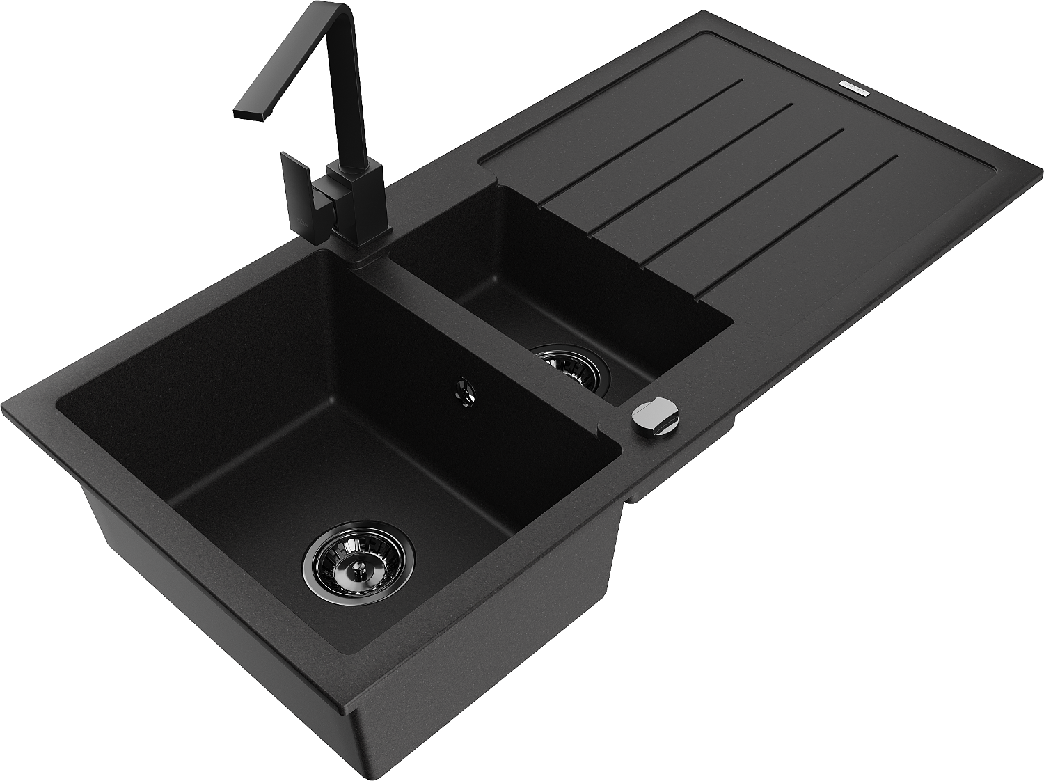 Mexen Andres évier en granit 1,5 bac avec égouttoir et robinet de cuisine Rita, noir moucheté - 6515-76-670300-70-B
