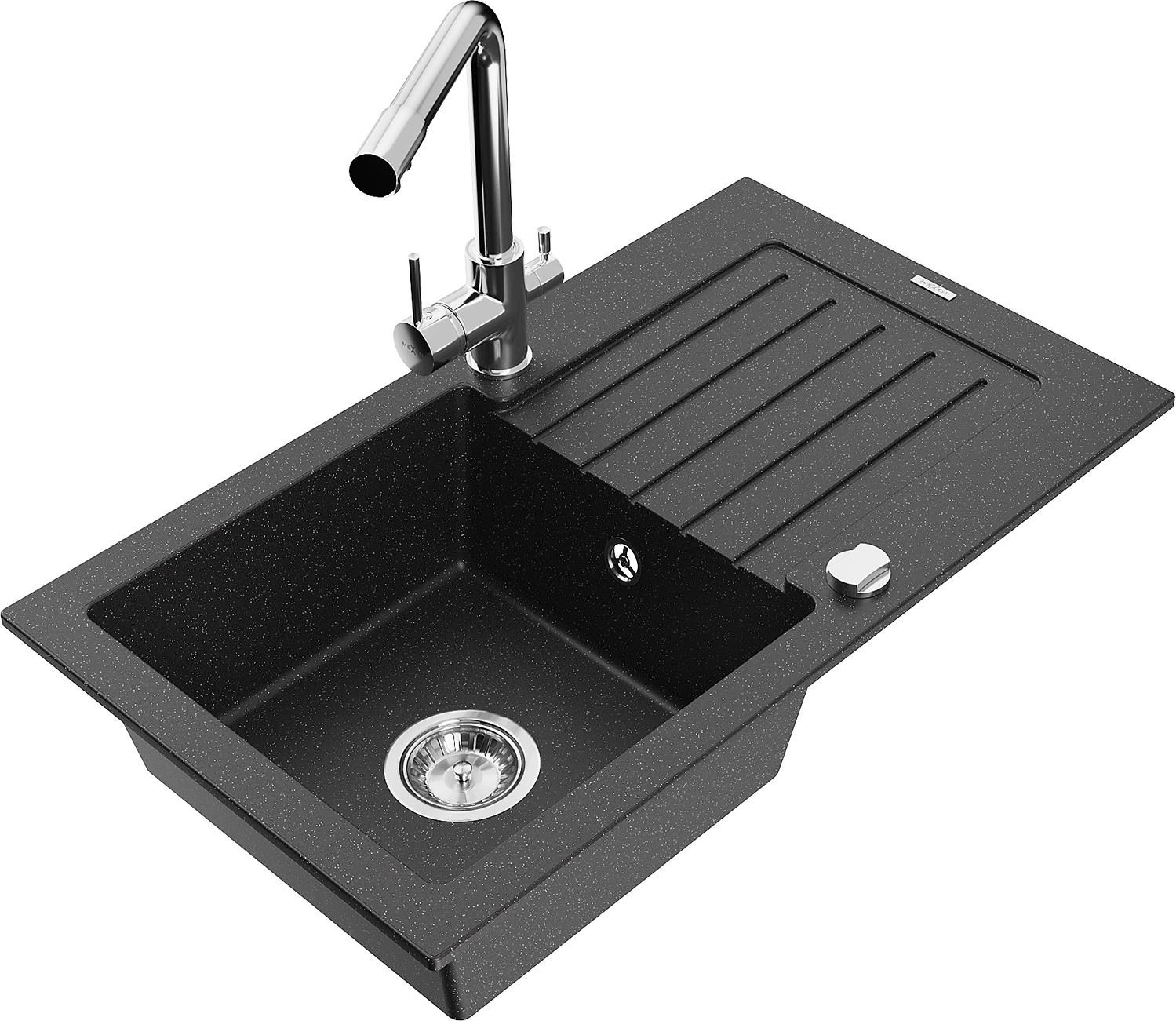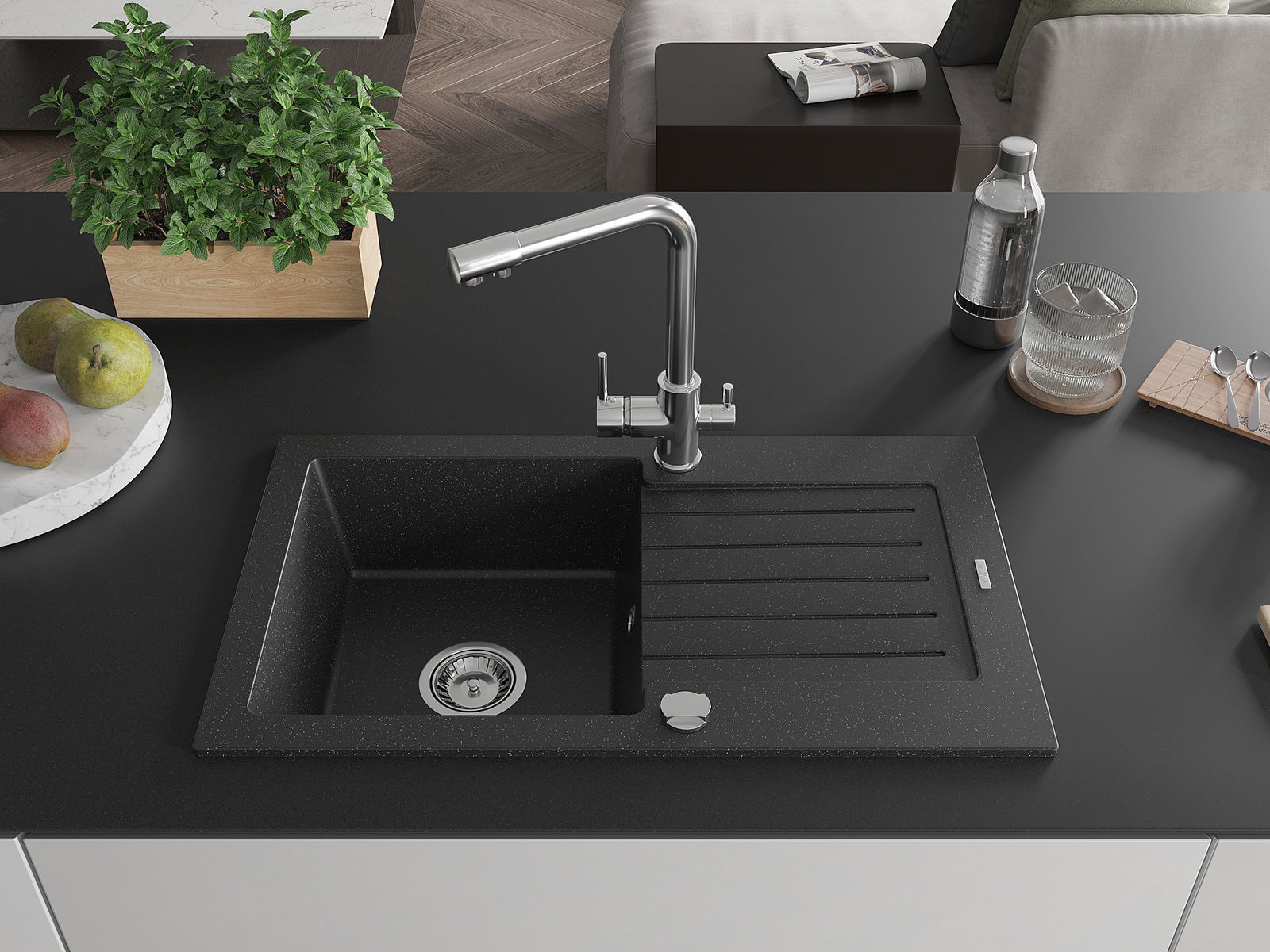 Mexen Pablo évier en granit 1 bac avec égouttoir et robinet de cuisine Duero, noir/métallique argenté - 6510-73-671600-00