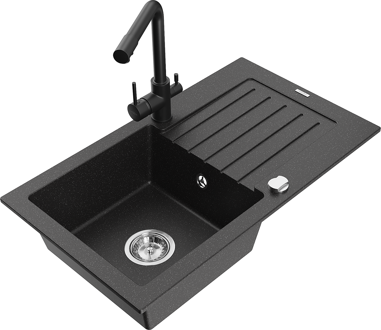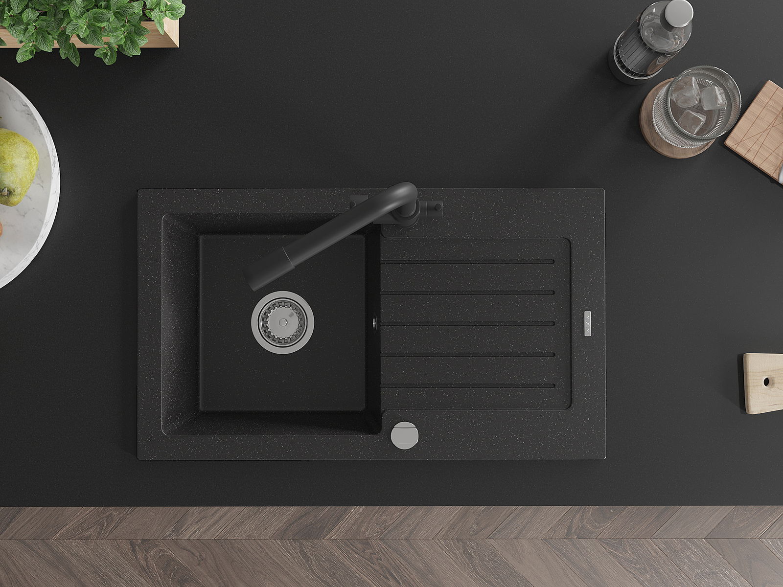 Mexen Pablo évier en granit à 1 bac avec égouttoir et robinet de cuisine Duero, noir/argent métallisé - 6510-73-671600-70