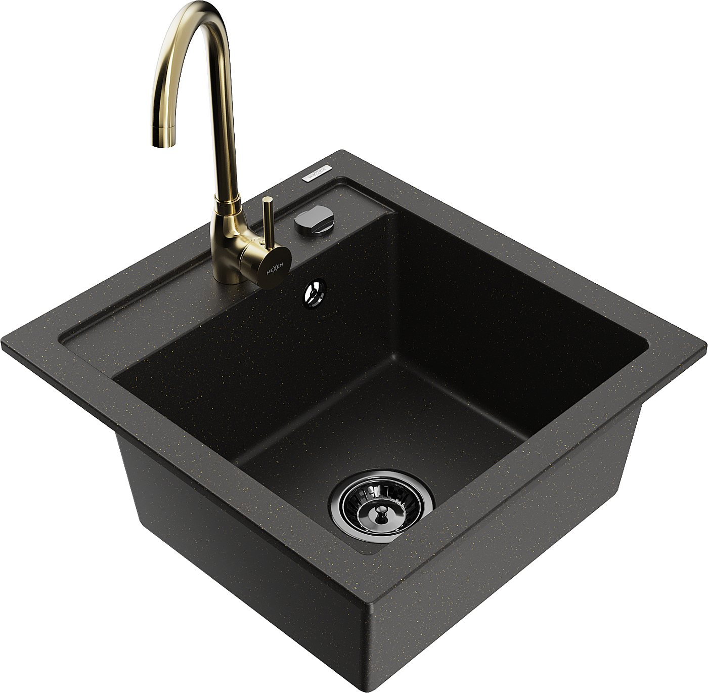 Mexen Vito évier en granit 1 bac avec mitigeur de cuisine Telma, noir/doré métallisé - 6503-75-670200-50-B
