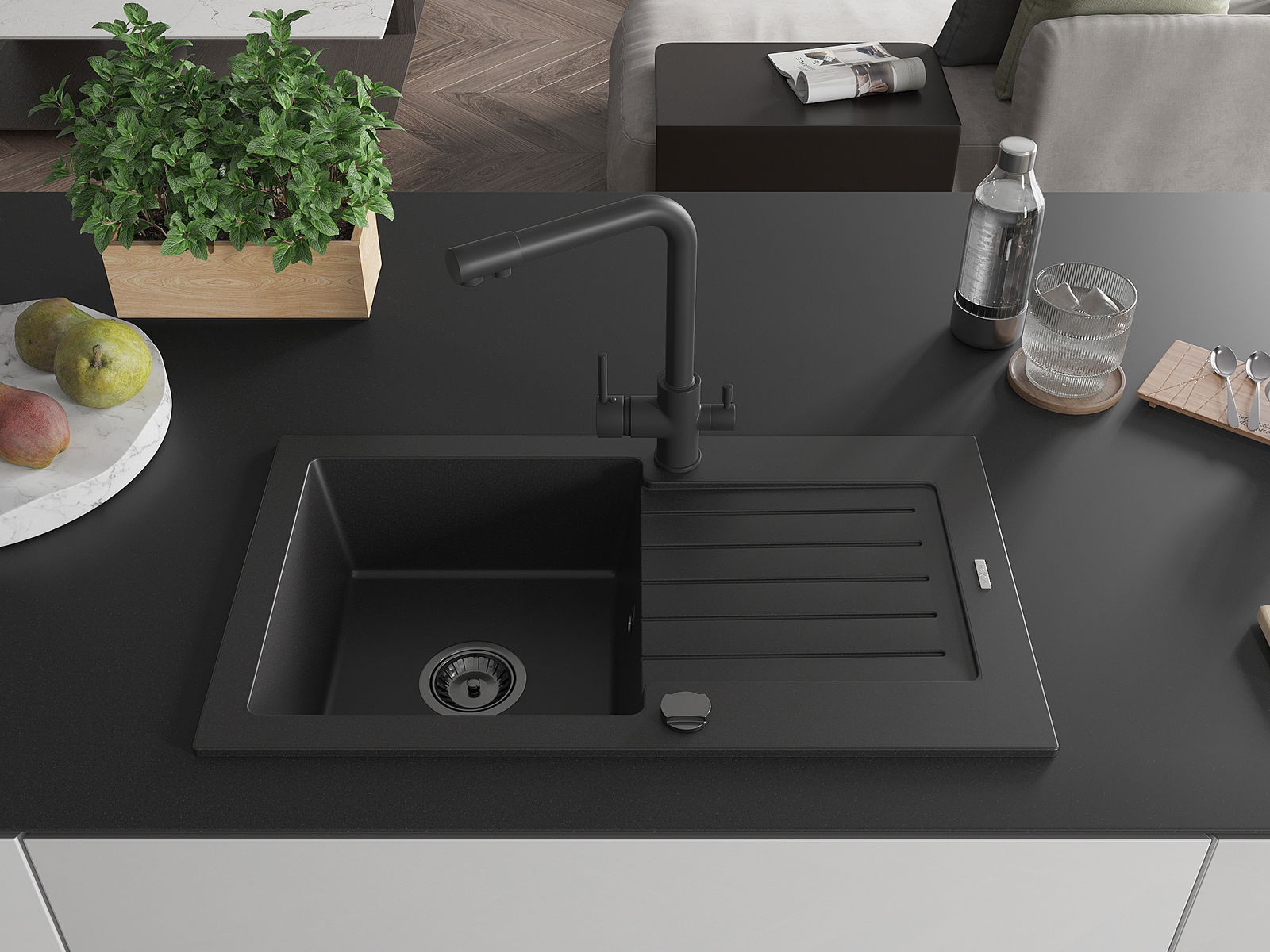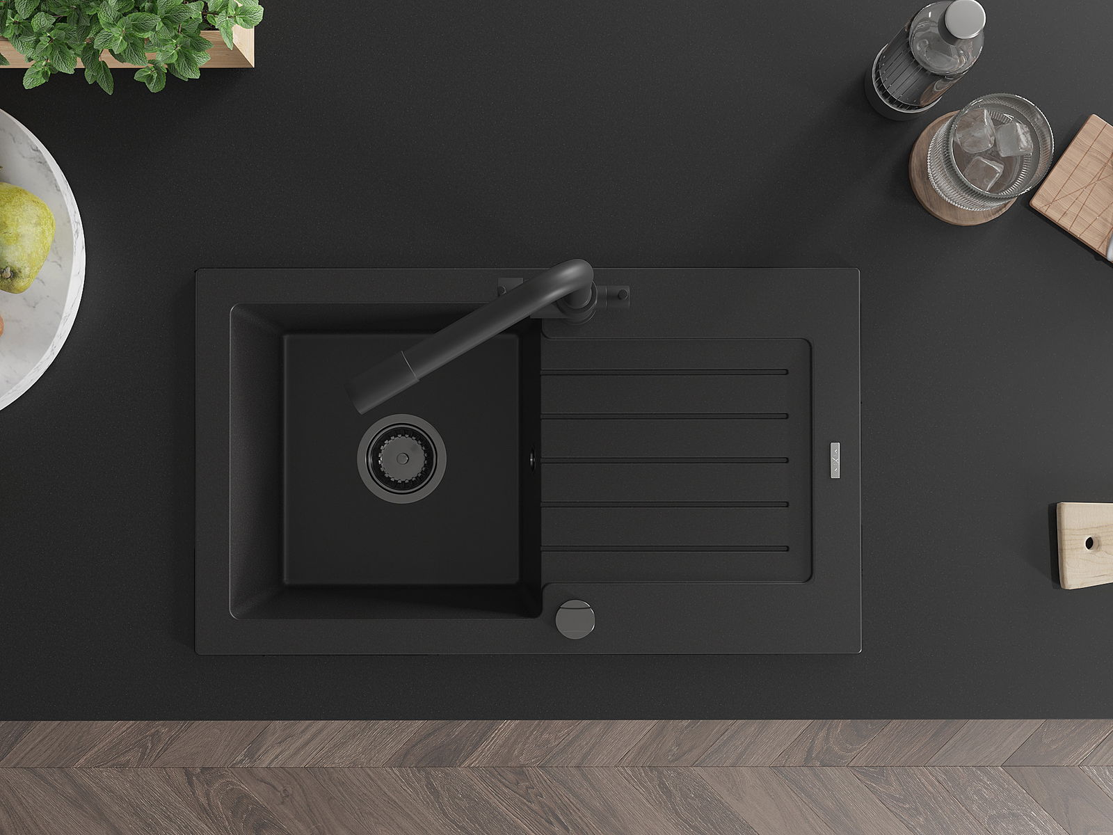 Mexen Pablo évier en granit 1 bac avec égouttoir et mitigeur de cuisine Duero, noir - 6510-77-671600-70-B