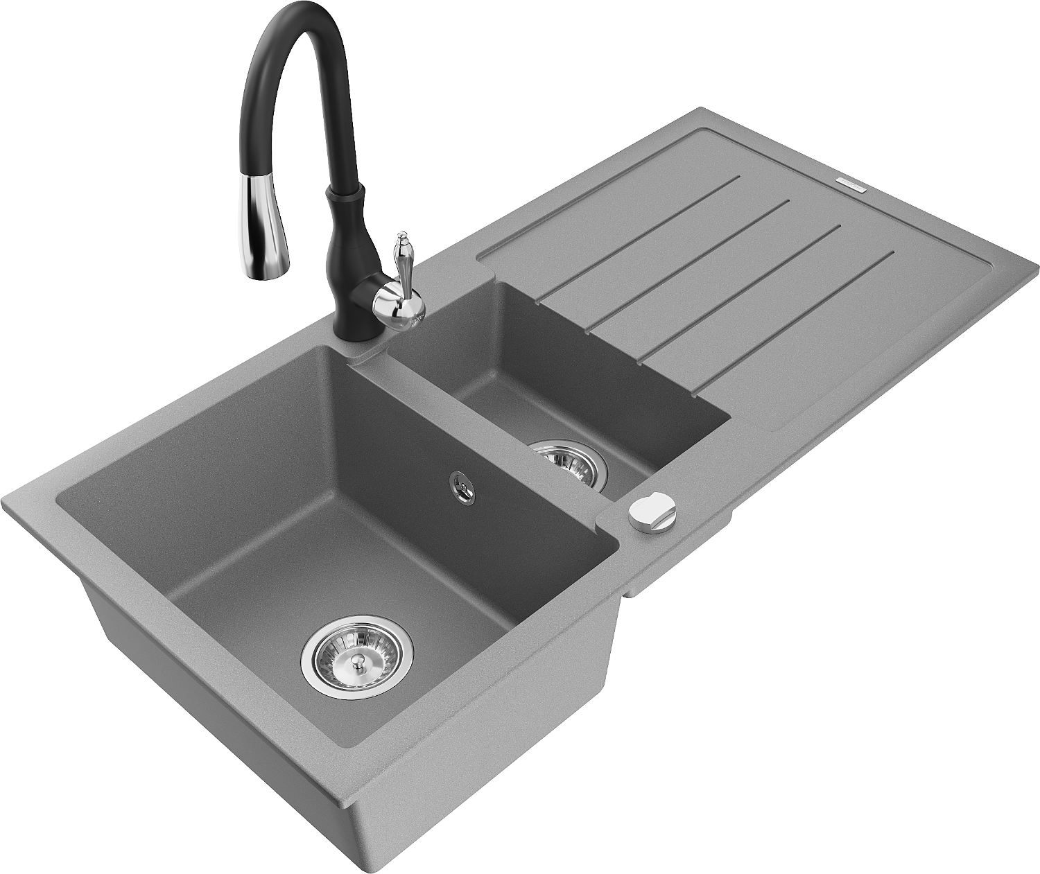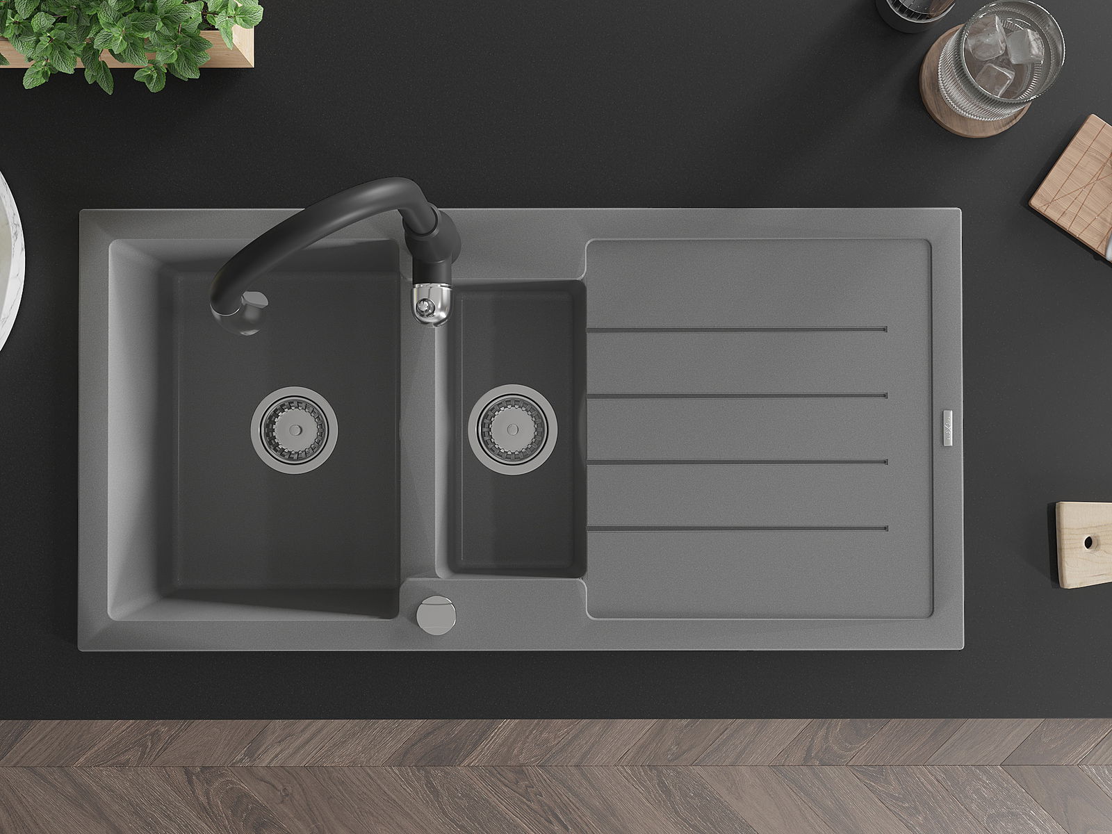 Mexen Andres évier en granit 1,5 bac avec égouttoir et robinet de cuisine Savita, gris - 6515-71-672601-70